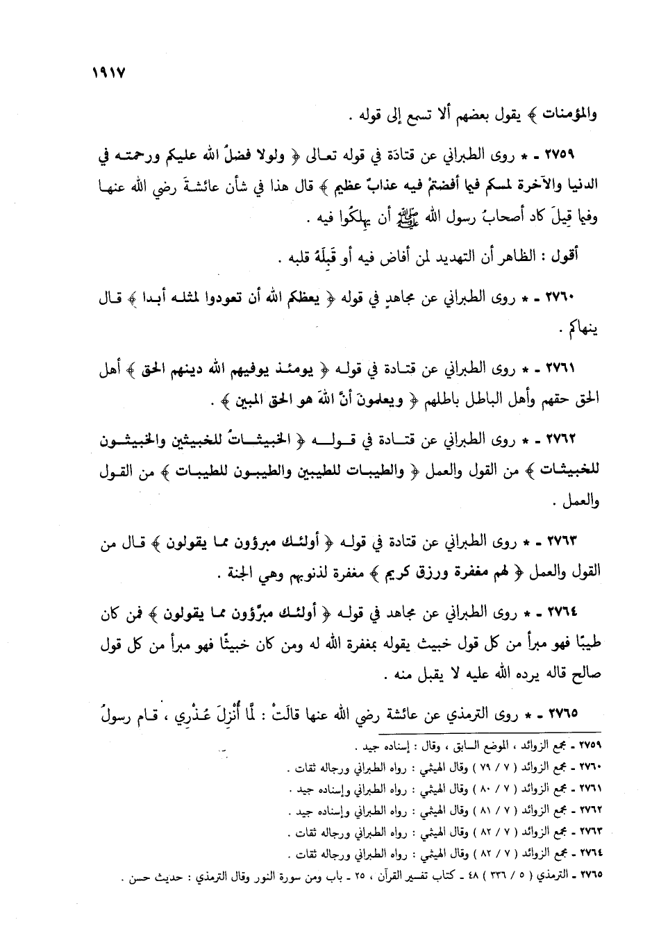 2759 - * روى الطبراني عن قتادة في قوله تعالى {وَلَوْلَا فَضْلُ اللَّهِ عَلَيْكُمْ وَرَحْمَتُهُ فِي الدُّنْيَا وَالْآخِرَةِ لَمَسَّكُمْ فِي مَا أَفَضْتُمْ فِيهِ عَذَابٌ عَظِيمٌ} قال هذا في شأن عائشة رضي الله عنها وفيما قِيلَ كاد أصحابُ رسول الله صلى الله عليه وسلم أن يهلكوا فيه.