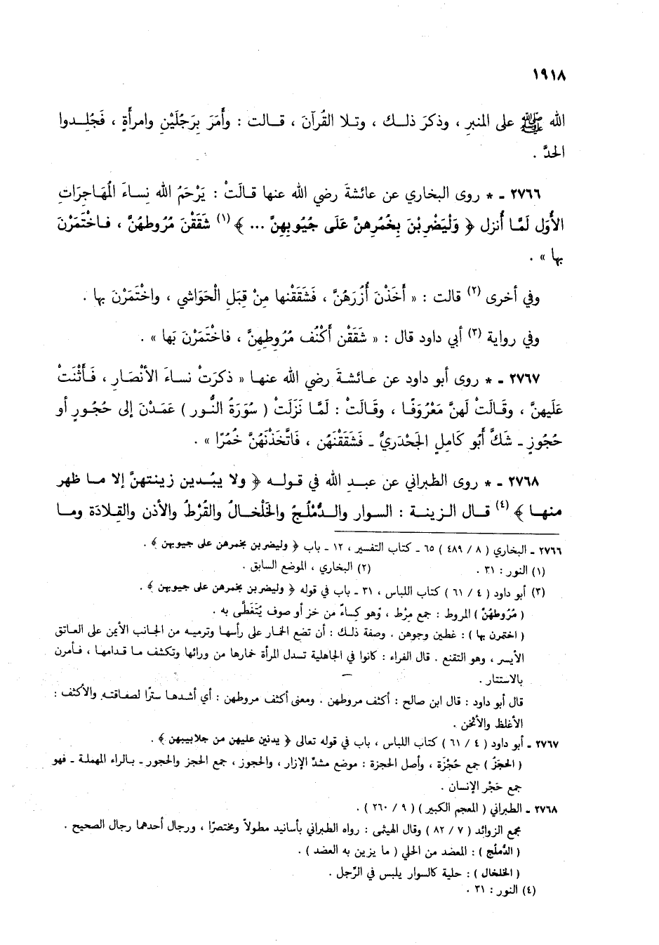 2767 - * روى أبو داود عن عائشة رضي الله عنها "ذكرت نساء الأنصار، فأثنتْ عليهن، وقالت لهن معروفاً، وقالت: لما نزلتْ (سورة النور) عمدن إلى جحورٍ أو جحورٍ - شك أبو كامل الجحدريُّ - فشققنهُن، فاتخذنهُن خُمراً".