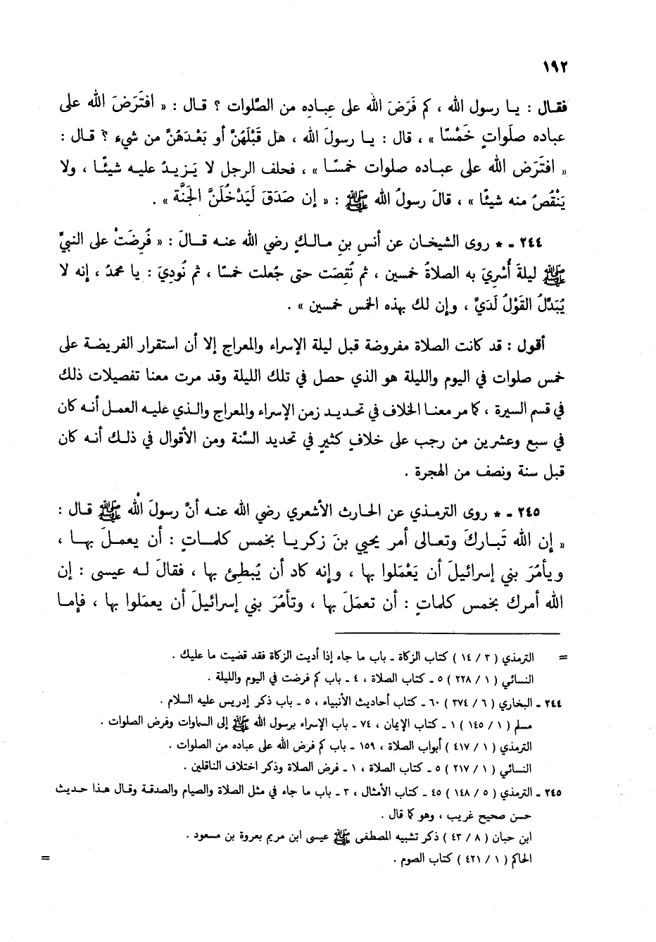 244 - * روى الشيخان عن أنس بن مالك رضي الله عنه قال: "فُرِضَتْ على النبي صلى الله عليه وسلم ليلة أُسري به الصلاة خمسين، ثم نُقِصَت حتى جُعلت خمساً، ثم نُودي: يا محمدُ، إنه لا يُبدلُ القول لديَّ، وإن لك بهذه الخمس خمسين".