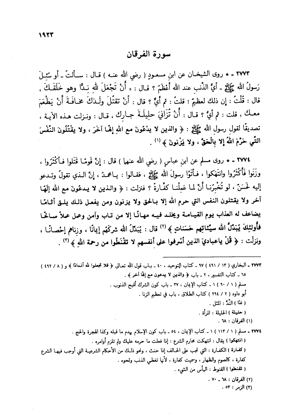 2773 - * روى الشيخان عن ابن مسعودٍ (رضي الله عنه) قال: سألتُ - أو سُئل رسول الله صلى الله عليه وسلم - أيُّ الذَّنبِ عند الله أعظمُ؟ قال: "أن تجعل لله نداً وهو خلقك، قال: قلتُ: إن ذلك لعظيم؛ قلت: ثم أيُّ؟ قال: أنْ تقتُلَ ولدك مخافةَ أنْ يطعم معك، قلت: ثم أيُّ؟ قال: أن تُزاني حليلةَ جارك، قال: ونزلت هذه الآية، تصديقاً لقول رسول الله صلى الله عليه وسلم: {وَالَّذِينَ لَا يَدْعُونَ مَعَ اللَّهِ إِلَهًا آخَرَ وَلَا يَقْتُلُونَ النَّفْسَ الَّتِي حَرَّمَ اللَّهُ إِلَّا بِالْحَقِّ وَلَا يَزْنُونَ} (1).