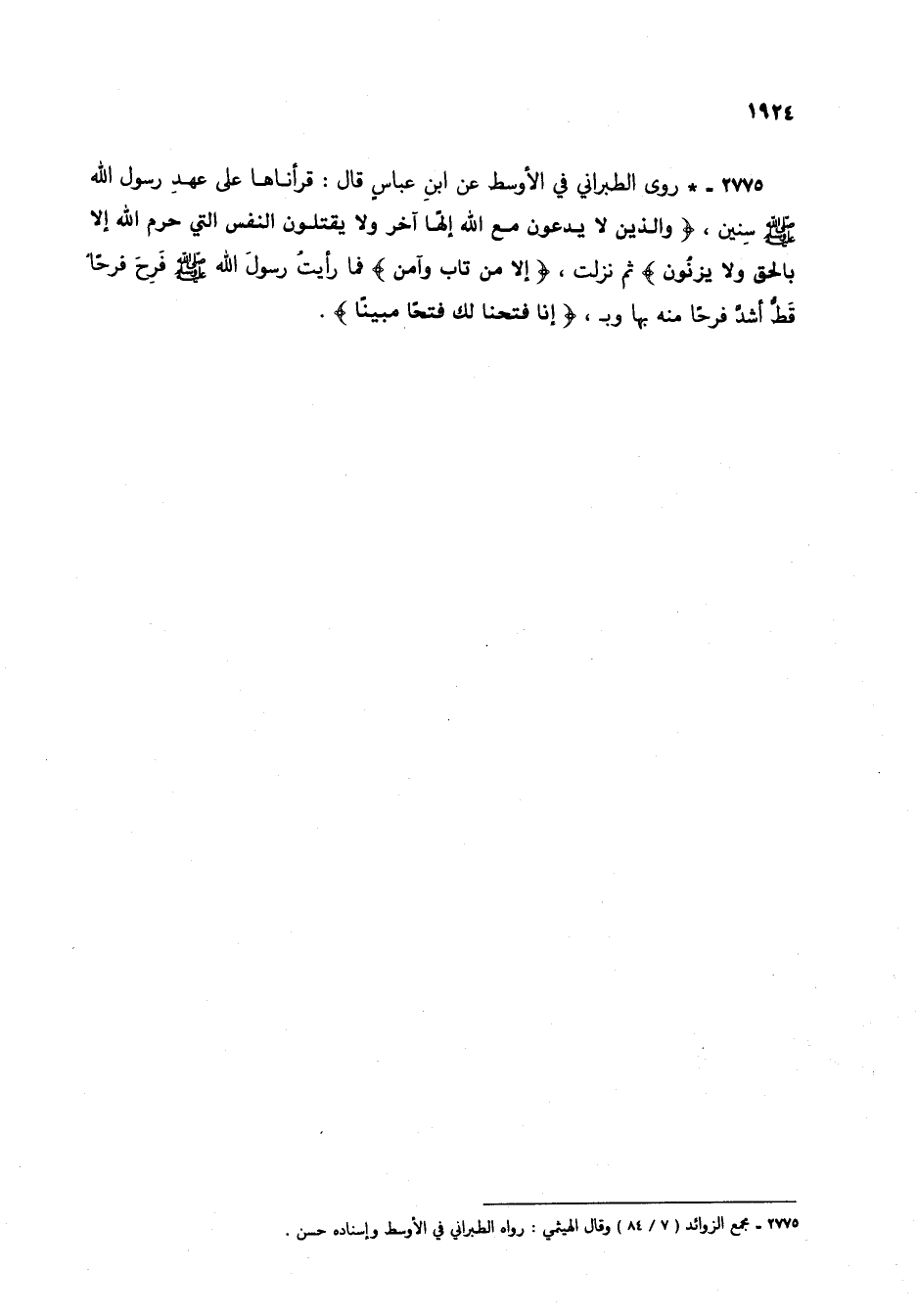 2775 - * روى الطبراني في الأوسط عن ابن عباس قال: قرأناها على عهد رسول الله صلى الله عليه وسلم سنين، {وَالَّذِينَ لَا يَدْعُونَ مَعَ اللَّهِ إِلَهًا آخَرَ وَلَا يَقْتُلُونَ النَّفْسَ الَّتِي حَرَّمَ اللَّهُ إِلَّا بِالْحَقِّ وَلَا يَزْنُونَ} ثم نزلت {إِلَّا مَنْ تَابَ وَآمَنَ} فما رأيت رسول الله صلى الله عليه وسلم فرح فرحاً قط أشد فرحاً منه بها وبـ، {إِنَّا فَتَحْنَا لَكَ فَتْحًا مُبِينًا} (1).