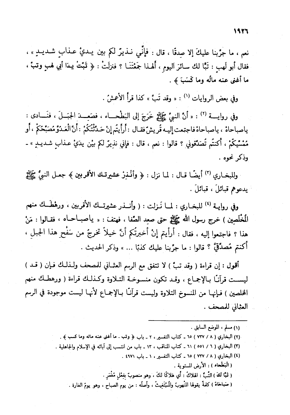 وفي رواية (2): "أن الني صلى الله عليه وسلم خرج إلى البطحاء، فصعد الجبل، فنادى: يا صباحاهْ، يا صباحاهُ فاجتمعت إليه قريشٌ فقال: أرأيتم إن حدثتكمْ: أن العدو مصبحكم، أو ممسيكمْ، أكنتم تصدقوني؟ قالوا: نعم، قال: فإني نذيرٌ لكم بين يديْ عذابٍ شديدٍ"- وذكر نحوه.