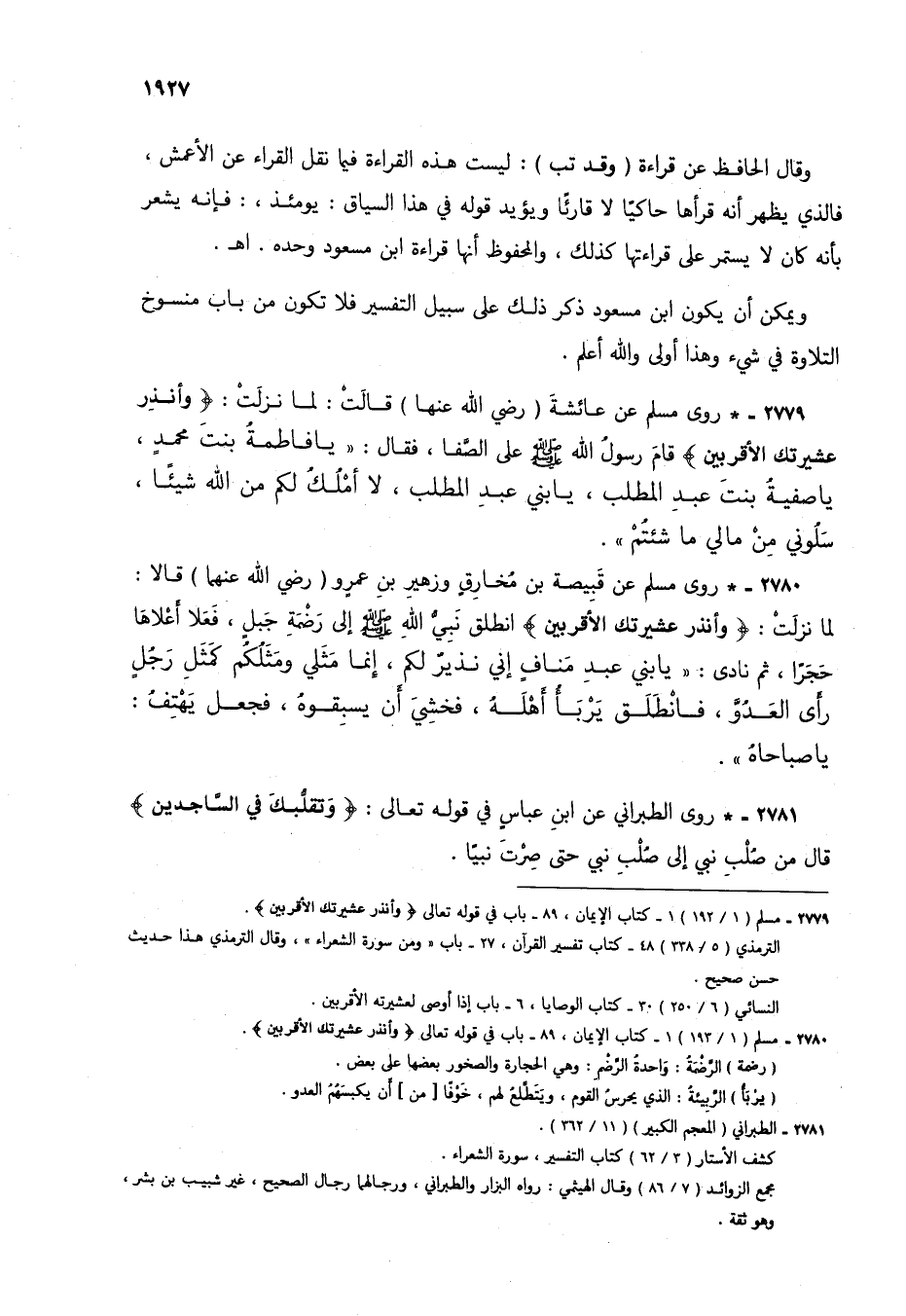 2779 - مسلم (1/ 192) 1 - كتاب الإيمان، 89 - باب فيقوله تعالى (وأنذر عشيرتك الأقربين).