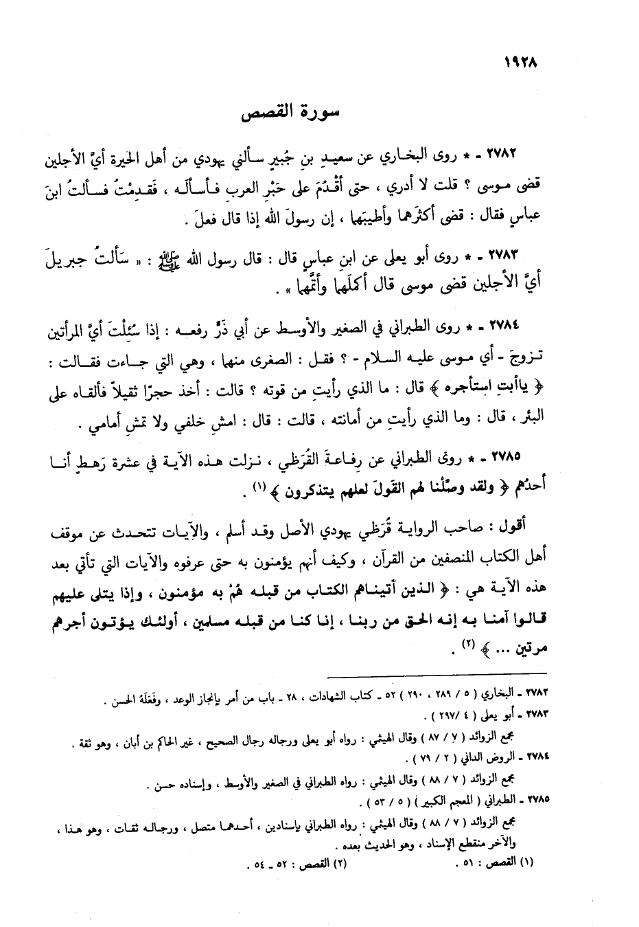 2782 - * روى البخاري عن سعيد بن جبير سألني يهودي من أهل الحيرة أيَّ الأجلين قضى موسى؟ قلت لا أدري، حتى أقدم على حبرِ العرب فأسأله، فقدمتُ فسألتُ ابن عباس فقال: قضى أكثرهما وأطيبهما، إن رسول الله إذا قال فعل.