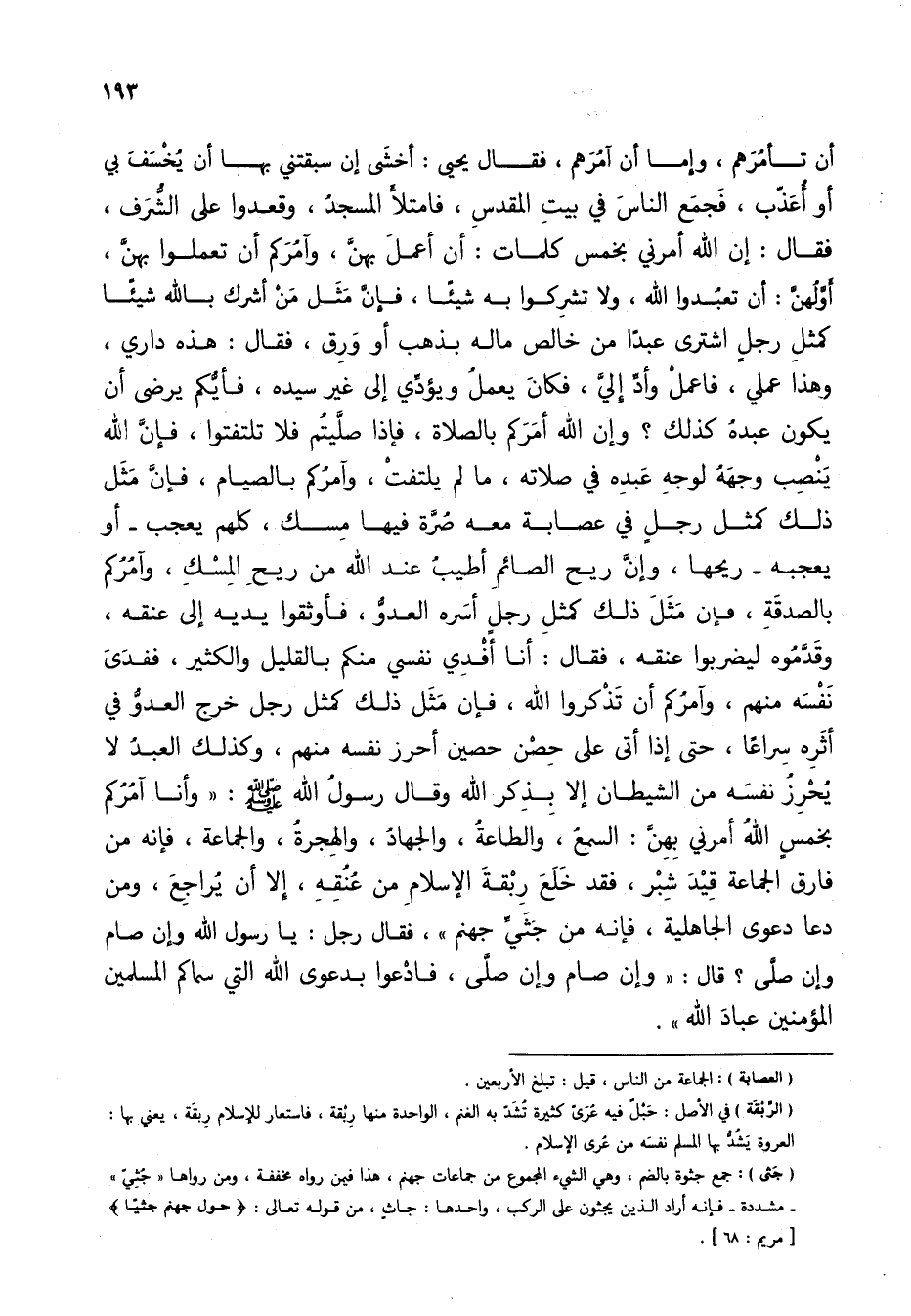 أن تأمُرهم، وإما أن آمُرَهم، فقال يحيى: أخشى إن سبقتني بها أن يُخْسَفَ بي أو أُعذب، فجمع الناس في بيت المقدس، فامتلأ المسجد، وقعدوا على الشُّرَف، فقال: إن الله أمرني بخمس كلمات: أن أعمل بهن، وآمركم أن تعملوا بهن، أولهن: أن تعبدوا الله، ولا تشركوا به شيئاً، فإن مثل من أشرك بالله شيئاً كمثل رجل اشترى عبداً من خالص ماله بذهب أو ورق، فقال: هذه داري، وهذا عملي، فاعمل وأدِّ إليَّ، فكان يعمل ويؤدي إلى غير سيده، فأيكم يرضى أن يكون عبده كذلك؟ وإن الله أمركم بالصلاة، فإذا صلَّيتُم فلا تلتفتوا، فإن مثل ذلك كمثل رجلٍ في عصابة معه صُرَّة فيها مسك، كلهم يعجب - أو يعجبه - ريحها، وإنَّ ريح الصائم أطيبُ عند الله من ريح المسك، وآمرُكم بالصدقة، فإن مثل ذلك كمثل رجل أسره العدوُّ، فأوثقوا يديه إلى عنقه، وقدموه ليضربوا عنقه، فقال: أنا أفدي نفسي منكم بالقليل والكثير، ففدى نفسه منهم، وآمركم أن تذكروا الله، فإن مثل ذلك مثل رجل خرج العدو في أثره سراعاً، حتى إذا أتى على حصن حصين أحرز نفسه منهم، وكذلك العبدُ لا يُحرز نفسه من الشيطان إلا بذكر الله وقال رسول الله صلى الله عليه وسلم: "وأنا آمركم بخمس الله أمرني بهن: السمع، والطاعةُ، والجهادُ، والهجرةُ، والجماعة، فإنه من فارق الجماعة قيد شِبْر، فقد خلع ربقة الإسلام من عنقه، إلا أن يُراجع، ومن دعا دعوى الجاهلية، فإنه من جثيِّ جهنم"، فقال رجل: يا رسول الله وإن صام وإن صلَّى؟ قال: "وإن صام وإن صلَّى، فادْعوا بدعوى الله التي سماكم المسلمين المؤمنين عباد الله".