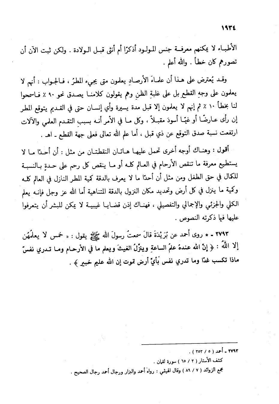 2793 - * روى أحمد عن بُريدة قال سمعت رسول الله صلى الله عليه وسلم يقول: "خمس لا يعلمهن إلا الله: {إِنَّ اللَّهَ عِنْدَهُ عِلْمُ السَّاعَةِ وَيُنَزِّلُ الْغَيْثَ وَيَعْلَمُ مَا فِي الْأَرْحَامِ وَمَا تَدْرِي نَفْسٌ مَاذَا تَكْسِبُ غَدًا وَمَا تَدْرِي نَفْسٌ بِأَيِّ أَرْضٍ تَمُوتُ إِنَّ اللَّهَ عَلِيمٌ خَبِيرٌ} (1).