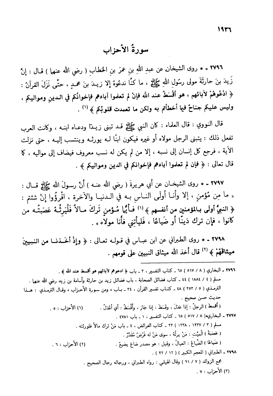 2796 - * روى الشيخان عن عبد الله بن عمر بن الخطاب (رضي الله عنهما) قال: إن زيد بن حارثة مولى رسول الله صلى الله عليه وسلم، ما كنا ندعوه إلا زيد بن محمدٍ، حتى نزل القرآن: {ادْعُوهُمْ لِآبَائِهِمْ هُوَ أَقْسَطُ عِنْدَ اللَّهِ فَإِنْ لَمْ تَعْلَمُوا آبَاءَهُمْ فَإِخْوَانُكُمْ فِي الدِّينِ وَمَوَالِيكُمْ وَلَيْسَ عَلَيْكُمْ جُنَاحٌ فِيمَا أَخْطَأْتُمْ بِهِ وَلَكِنْ مَا تَعَمَّدَتْ قُلُوبُكُمْ} (1).