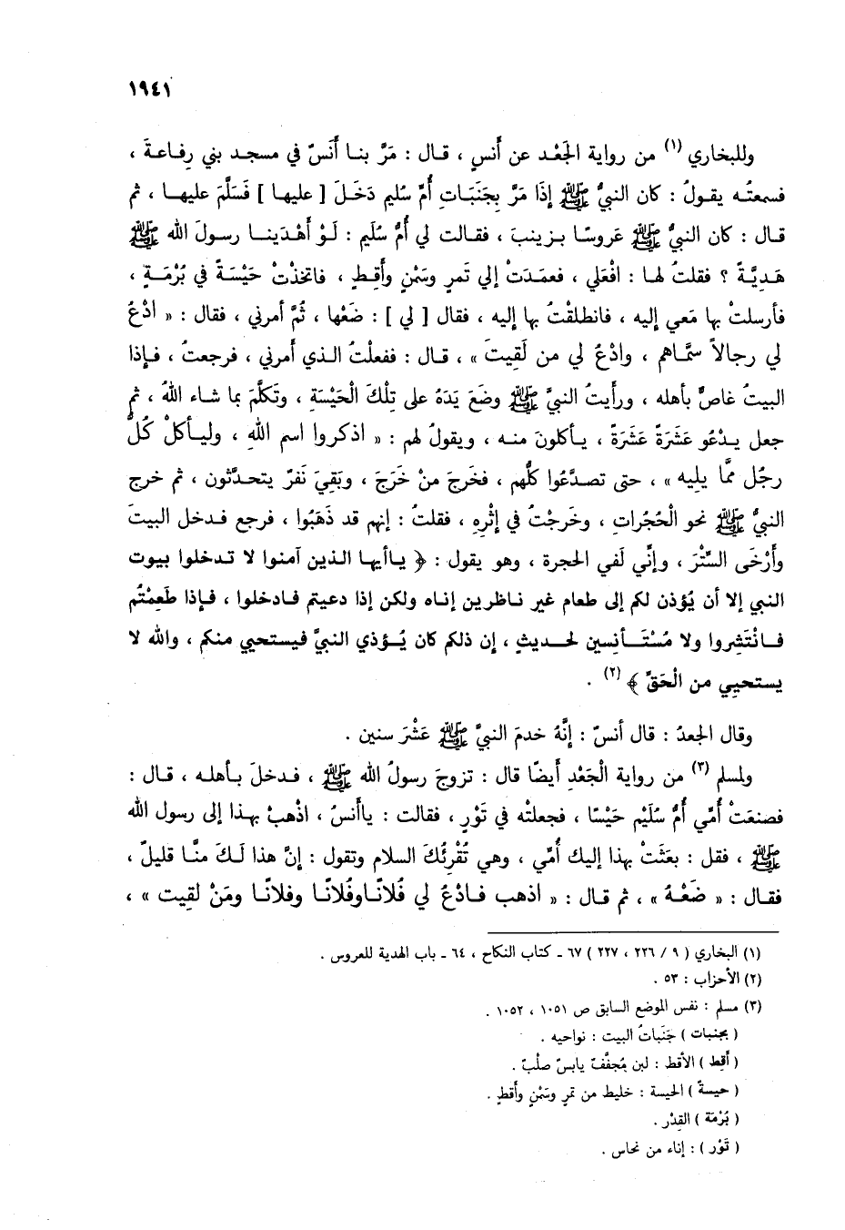 وللبخاري (1) من رواية الجعْد عن أنسٍ، قال: مر بنا أنسٌ في مسجد بني رفاعة، فسمعته يقول: كان النبي صلى الله عليه وسلم إذا مرَّ بجنباتِ أم سُليم دخل [عليها] فسلَّم عليها، ثم قال: كان النبي صلى الله عليه وسلم عروساً بزينب، فقالت لي أمُّ سُليم: لو أهدينا رسول الله صلى الله عليه وسلم هدية؟ فقلت لها: افعلي، فعمدتْ إلى تمرٍ وسمنٍ وأقطٍ، فاتخذتْ حيسةً في بُرمةٍ، فأرسلت بها معي إليه، فانطلقتُ بها إليه، فقال [لي]: ضعها، ثم أمرني، فقال: "ادعُ لي رجالاً سماهم، وادعُ لي من لقيت"، قال: ففعلتُ الذي مرني، فرجعتُ، فإذا البيت غاصٌّ بأهله، ورأيت النبي صلى الله عليه وسلم وضع يدهُ على تلك الحيسةِ، وتكلم بما شاء الله، ثم جعل يدعو عشرة عشرةً، يأكلون منه، ويقول لهم: "اذكروا اسم الله، وليأكل كل رجل مما يليه"، حتى تصدعُوا كلهم، فخرج من خرج، وبقي نفرٌ يتحدثون، ثم خرج النبي صلى الله عليه وسلم نحو الحُجراتِ، وخرجتُ في إثره، فقلت: إنهم قد ذهبوا، فرجع فدخل البيت وأرخى الستر، وإني لفي الحجرة، وهو يقول: {يَاأَيُّهَا الَّذِينَ آمَنُوا لَا تَدْخُلُوا بُيُوتَ النَّبِيِّ إِلَّا أَنْ يُؤْذَنَ لَكُمْ إِلَى طَعَامٍ غَيْرَ نَاظِرِينَ إِنَاهُ وَلَكِنْ إِذَا دُعِيتُمْ فَادْخُلُوا فَإِذَا طَعِمْتُمْ فَانْتَشِرُوا وَلَا مُسْتَأْنِسِينَ لِحَدِيثٍ إِنَّ ذَلِكُمْ كَانَ يُؤْذِي النَّبِيَّ فَيَسْتَحْيِي مِنْكُمْ وَاللَّهُ لَا يَسْتَحْيِي مِنَ الْحَقِّ} (2).