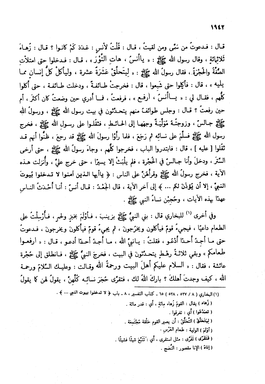 قال: فدعوتُ من سمى ومن لقيتُ، قال: قلتُ لأنسٍ: عدد كمْ كانوا؟ قال: زُهاء ثلاثمائة، وقال رسول الله صلى الله عليه وسلم: "يا أنسُ، هات التوْرَ"، قال: فدخلوا حتى امتلأت الصُّفة والحُجرة، فقال رسول الله صلى الله عليه وسلم: "ليتحلقْ عشرةٌ عشرة، وليأكلْ كلُّ إنسان مما يليه"، قال: فأكلوا حتى شبعوا، قال: فخرجت طائفة، ودخلت طائفة، حتى أكلوا كلهم، فقال لي: "يا أنس، ارفع"، فرفعتُ، فما أدري حين وضعتُ كان أكثر، أم حين رفعتُ؟ قال: وجلس طوائفُ منهم يتحدثون في بيت رسول الله صلى الله عليه وسلم، ورسول الله صلى الله عليه وسلم جالسٌ، وزوجته موليةٌ وجهها إلى الحائط، فثقُلوا على رسول الله صلى الله عليه وسلم، فخرج رسول الله صلى الله عليه وسلم فسلم على نسائه ثم رجع، فلما رأوا رسول الله صلى الله عليه وسلم قد رجع، ظنوا أنهم قد ثقلوا [عليه]، قال: فابتدروا الباب، فخرجوا كلهم، وجاء رسول الله صلى الله عليه وسلم، حتى أرخى الستر، ودخل وأنا جالسٌ في الحجرة، فلم يلبثْ إلا يسيراً، حتى خرج عليَّ، وأنزلت هذه الآية، فخرج رسول الله صلى الله عليه وسلم وقرأهن على الناس: {يَاأَيُّهَا الَّذِينَ آمَنُوا لَا تَدْخُلُوا بُيُوتَ النَّبِيِّ إِلَّا أَنْ يُؤْذَنَ لَكُمْ} إلى آخر الآية، قال الجعد: قال أنسٌ: أنا أحدثُ الناس عهداً بهذه الآيات، وحُجبن نساء النبي صلى الله عليه وسلم.