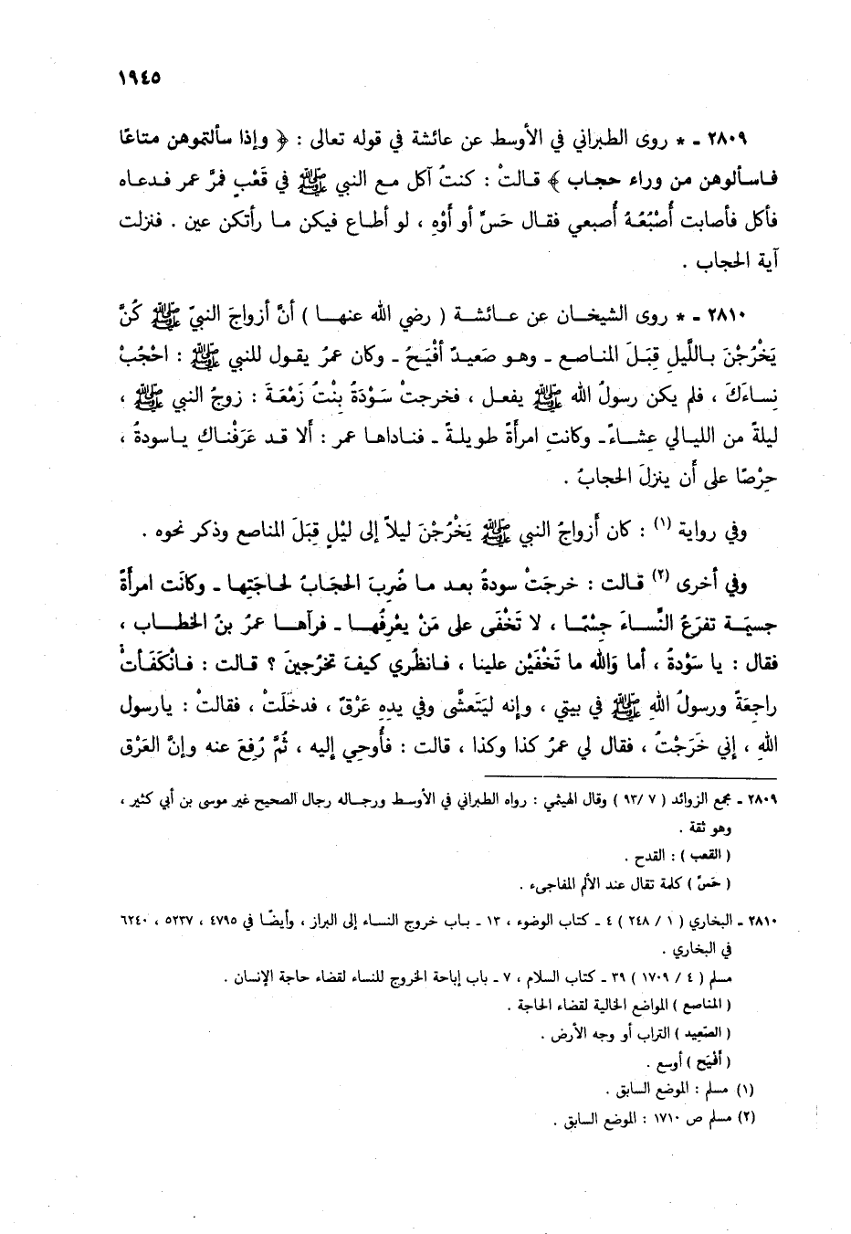 2810 - * روى الشيخان عن عائشة (رضي الله عنها) أن أزواج النبي صلى الله عليه وسلم كُنَّ يخْرُجن بالليل قِبَلَ المناصع - وهو صعيدٌ أفْيَحُ- وكان عمر يقول للنبي صلى الله عليه وسلم: احجُبْ نساءك، فلم يكن رسول الله صلى الله عليه وسلم يفعل، فخرجتْ سودةُ بنت زمعة: زوج النبي صلى الله عليه وسلم، ليلة من الليالي عشاء- وكانت امرأةً طويلةً - فناداها عمر: ألا قد عرفناك يا سودةُ، حرصاً على أن ينزل الحجاب.