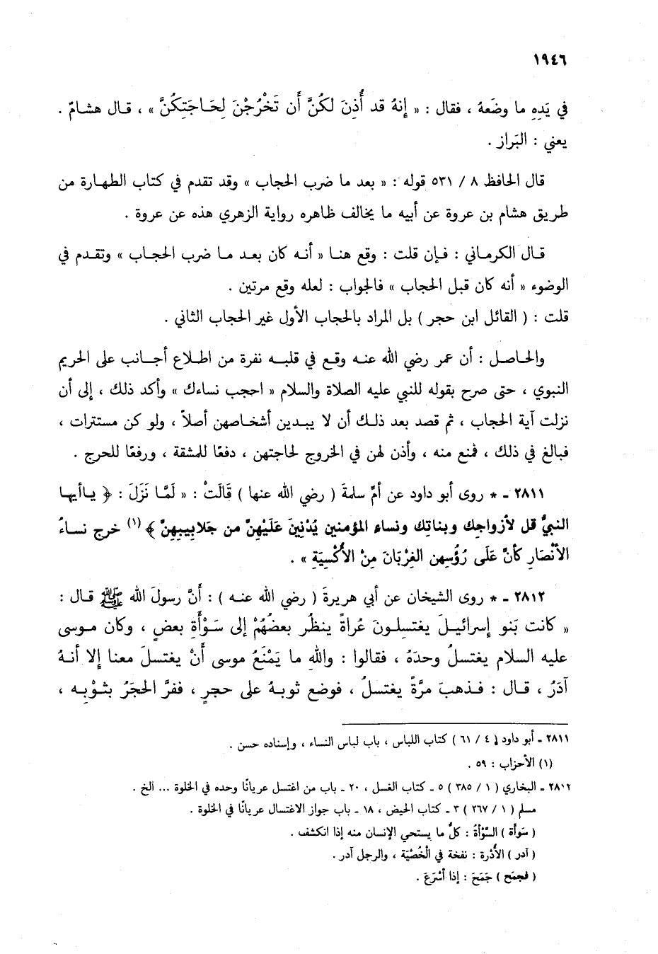 2812 - * روى الشيخان عن أبي هريرة (رضي الله عنه): أن رسول الله صلى الله عليه وسلم قال: "كانت بنو إسرائيل يغتسلون عُراةً ينظر بعضهم إلى سوأة بعضٍ، وكان موسى عليه السلام يغتسل وحده، فقالوا: والله ما يمنع موسى أن يغتسل معنا إلا أنه آدَرُ، قال: فذهب مرةً يغتسل، فوضع ثوبه على حجرٍ، ففرَّ الحجرُ بثوبه،