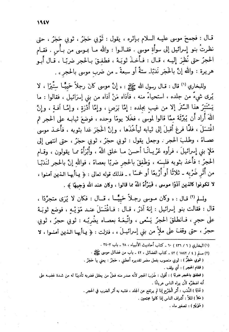 ولمسلم (2) قال: "وكان موسى رجلاً حيياً، قال: فكان لا يُرى متجرداً، قال: فقالت بنو إسرائيل: إنه آدَرُ، قال: فاغتسل عند مُوَيْهٍ، فوضع ثوبه على حجر، فانطلق الحجر يسعى، واتبعه بعصاه يضربهك ثوبي حجر، ثوبي حجر، حتى وقف على ملأٍ من بني إسرائيل"، فنزلت: {يَاأَيُّهَا الَّذِينَ آمَنُوا لَا