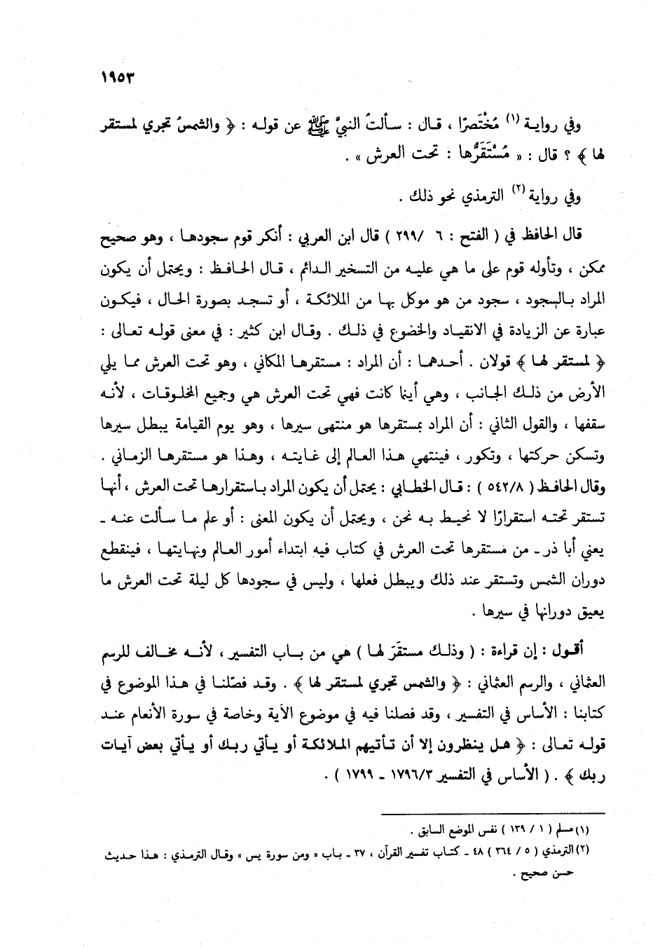 قال الحافظ في (الفتح: 6/ 299) قال ابن العربي: أنكر قوم سجودها، وهو صحيح ممكن، وتأوله قوم على ما هي عليه من التسخير الدائم، قال الحافظ: ويحتمل أن يكون المراد بالسجود، سجود من هو موكل بها من الملائكة، أو تسجد بصورة الحال، فيكون عبارة عن الزيادة في الانقياد والخضوع في ذلك. وقال ابن كثير: في معنى قوله تعالى {} قولان. أحدهما: أن المراد: مستقرها المكاني، وهو تحت العرش مما يلي الأرض من ذلك الجانب، وهي أينما كانت فهي تحت العرش هي وجميع المخلوقات، لأنه سقفها، والقول الثاني: أن المراد بمستقرها هو منتهى سيرها، وهو يوم القيامة يبطل سيرها وتسكن حركتها، وتكور، فينتهي هذا العالم إلى غايته، وهذا هو مستقرها الزماني. وقال الحافظ (8/ 542): قال الخطابي: يحتمل أن يكون المراد باستقرارها تحت العرش، أنها تستقر تحته استقراراً لا نحيط به نحن، ويحتمل أن يكون المعنى: أو علم ما سألت عنه - يعني أبا ذر - من مستقرها تحت العرش في كتاب فيه ابتداء أمور العالم ونهايتها، فينقطع دوران الشمس وتستقر عند ذلك ويبطل فعلها، وليس في سجودها كل ليلة تحت العرش ما يعيق دورانها في سيرها.