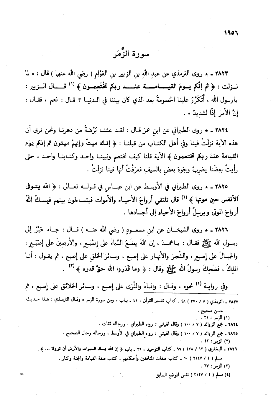 2824 - * روى الطبراني عن ابن عمر قال: لقد عشنا بُرهةً من دهرنا ونحن نرى أن هذه الآية نزلت فينا وفي أهل الكتاب من قبلنا: {إِنَّكَ مَيِّتٌ وَإِنَّهُمْ مَيِّتُونَ ثُمَّ إِنَّكُمْ يَوْمَ الْقِيَامَةِ عِنْدَ رَبِّكُمْ تَخْتَصِمُونَ} الآية قلنا كيف نختصم ونبينا واحد وكتابنا واحد، حتى رأيت بعضنا يضرب وجوه بعضٍ بالسيف فعرفتُ أنها فينا نزلتْ.