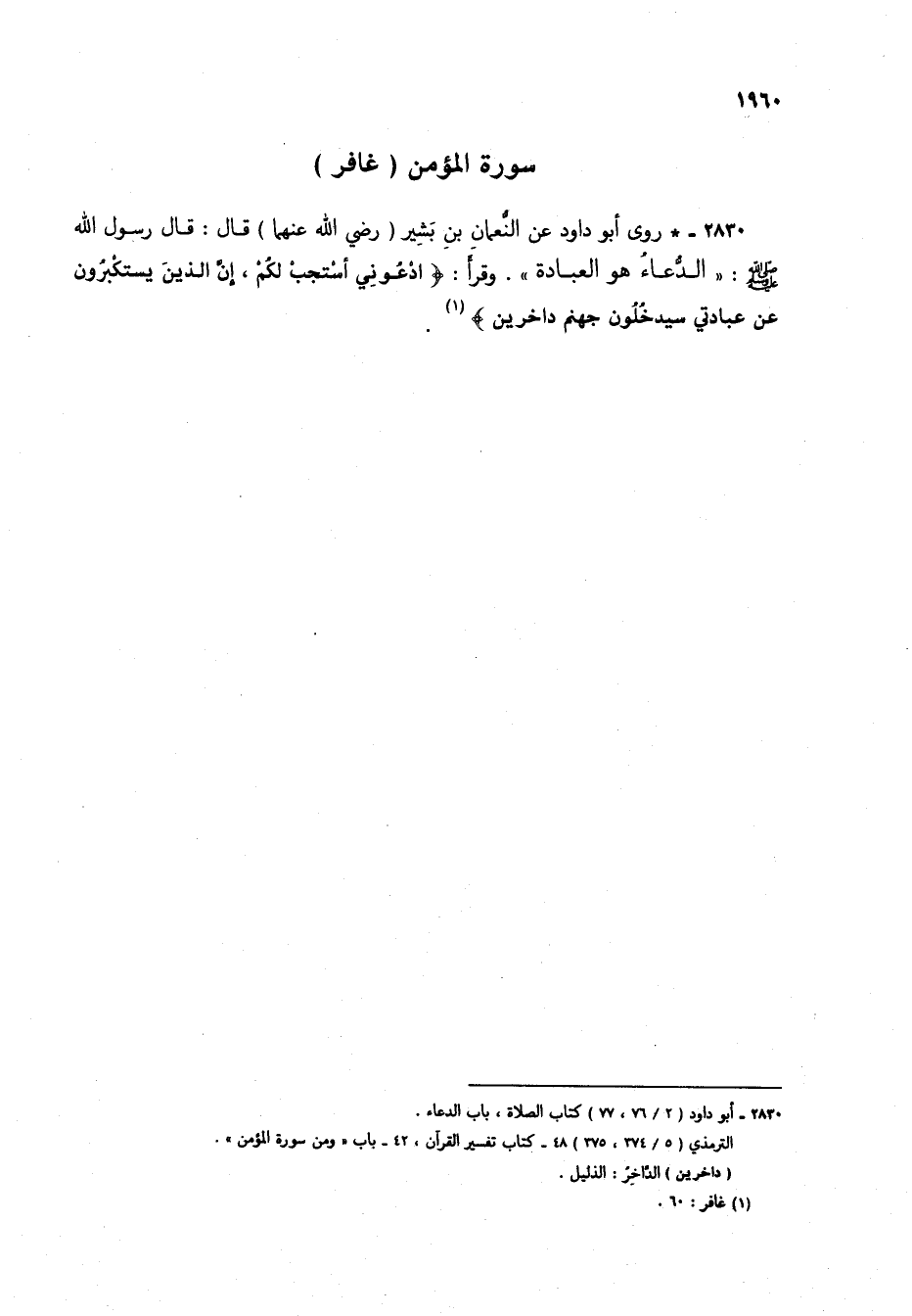 2830 - * روى أبو داود عن النُّعمان بن بشير (رضي الله عنهما) قال: قال رسول الله صلى الله عليه وسلم: "الدعاء هو العبادة". وقرأ: {وَقَالَ رَبُّكُمُ ادْعُونِي أَسْتَجِبْ لَكُمْ إِنَّ الَّذِينَ يَسْتَكْبِرُونَ عَنْ عِبَادَتِي سَيَدْخُلُونَ جَهَنَّمَ دَاخِرِينَ} (1).