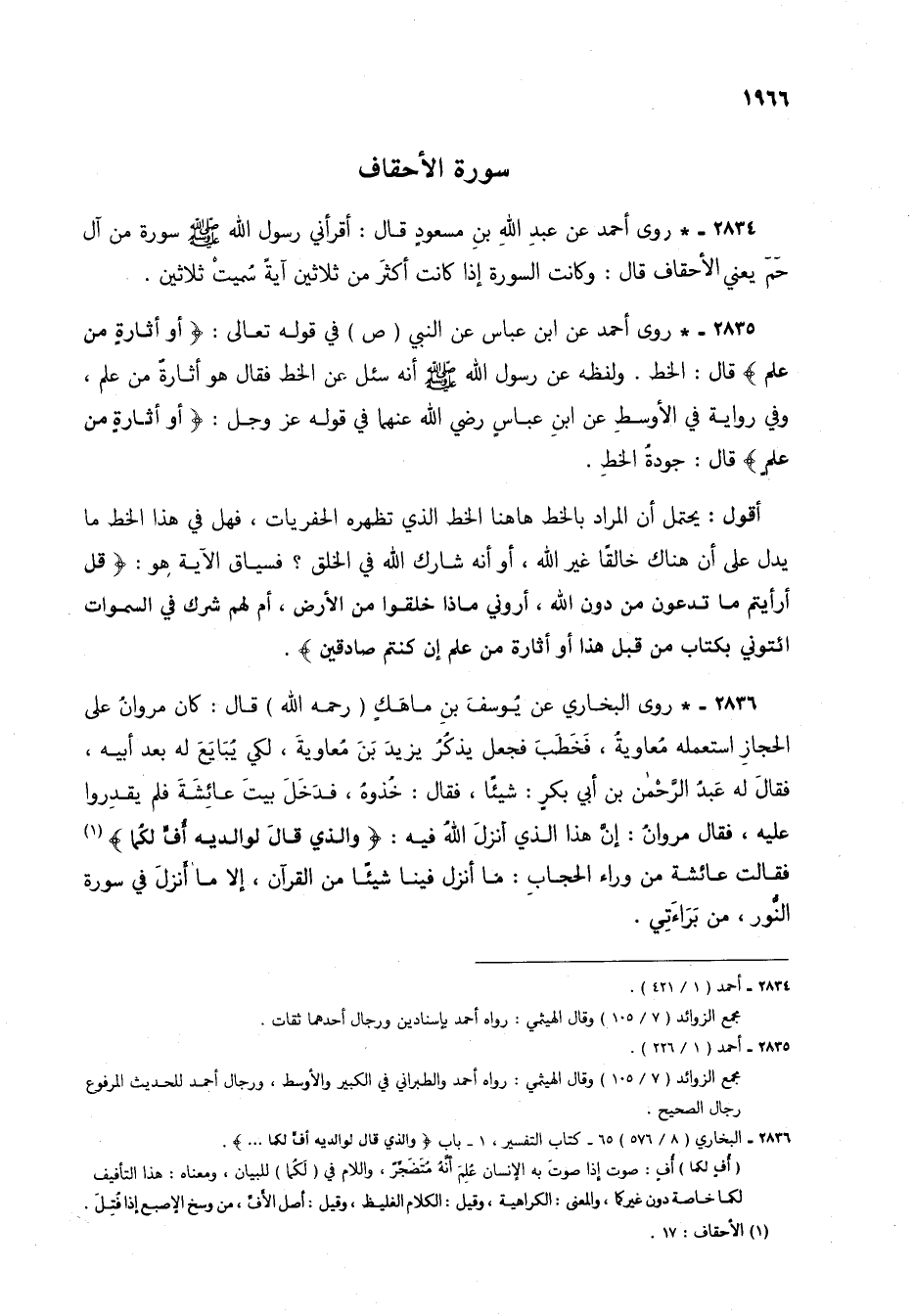 2834 - * روى أحمد عن عبد الله بن مسعود قال: أقرأني رسول الله صلى الله عليه وسلم سورة من آل حم يعني الأحقاف قال: وكانت السورة إذا كانت أكثر من ثلاثين آيةً سُميتْ ثلاثين.
