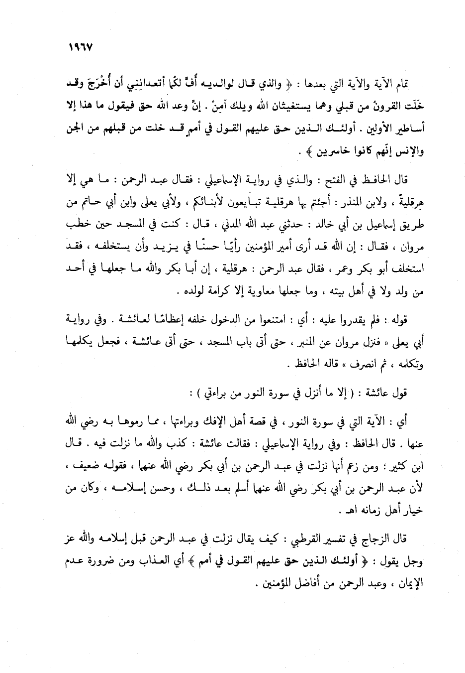 قال الزجاج في تفسير القرطبي: كيف يقال نزلت في عبد الرحمن قبل إسلامه والله عز وجل يقول: {أُولَئِكَ الَّذِينَ حَقَّ عَلَيْهِمُ الْقَوْلُ فِي أُمَمٍ} أي العذاب ومن ضرورة عدم الإيمان، وعبد الرحمن من أفاضل المؤمنين.
