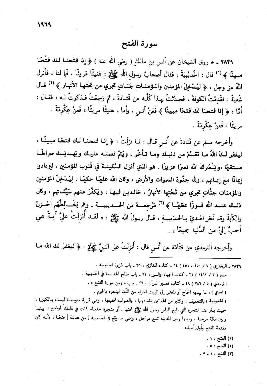 2839 - * روى الشيخان عن أنس بن مالك (رضي الله عنه) {إِنَّا فَتَحْنَا لَكَ فَتْحًا مُبِينًا} (1) قال: الحديبية، فقال أًحاب رسول الله صلى الله عليه وسلم: هنيئاً مريئاً، فما لنا، فأنزل الله عز وجل، {لِيُدْخِلَ الْمُؤْمِنِينَ وَالْمُؤْمِنَاتِ جَنَّاتٍ تَجْرِي مِنْ تَحْتِهَا الْأَنْهَارُ} (2) قال شعبة، فقدمتُ الكوفة، فحدثت بهذا كله عن قتادة، ثم رجعت فذكرت له، فقال: أما: {إِنَّا فَتَحْنَا لَكَ فَتْحًا مُبِينًا} فعن أنس، وأما "هنيئاً مريئاً" فعن عكرمة.