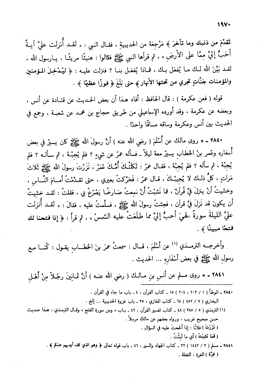 2840 - * روى مالك عن أسلم (رضي الله عنه) أن رسول الله صلى الله عليه وسلم كان يسير في بعض أسفاره وعمر بن الخطاب يسير معه ليلاً - فسأله عمر عن شيءٍ؟ فلم يُجبه، ثم سأله؟ فلم يجبه، ثم سأله؟ فلم يجبه، فقال عمر: ثكلتك أمك عمر، نزرت رسول الله صلى الله عليه وسلم ثلاث مرات، كل ذلك لا يجيبك، قال عمر: فحركتُ بعيري، حتى تقدمتُ أما مالناس، وخشيت أن ينزل في قُرآنٌ، فما نشبتُ أن سمعت صارخاً يصرخ بي، فقلت: لقد خشيت أن يكون قد نزل في قرآن، فجئت رسول الله صلى الله عليه وسلم، فسلمت عليه، فقال: "لقد أنزلت عليَّ الليلة سورة، لهي أحبُّ إليَّ مما طلعتْ عليه الشمسُ"، ثم قرأ: {إِنَّا فَتَحْنَا لَكَ فَتْحًا مُبِينًا}.
