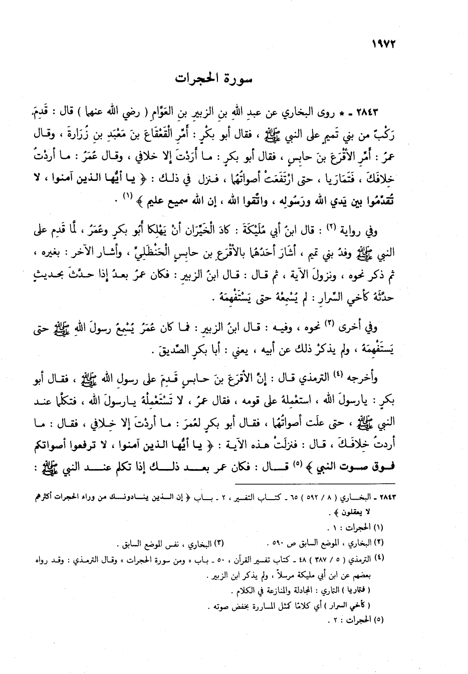 2843 - * روى البخاري عن عبد الله بن الزبير بن العوام (رضي الله عنهما) قال: قدم ركب من بني تميم على النبي صلى الله عليه وسلم، فقال أبو بكر: أمر القعقاع بن معبد بن زُرارة، وقال عمر: أمر الأقرع بن حابس، فقال أبو بكر: ما أردت إلا خلافي، وقال عمر: ما أردت خلافك، فتماريا، حتى ارتفعت أصواتهما، فنزل في ذلك: {يَاأَيُّهَا الَّذِينَ آمَنُوا لَا تُقَدِّمُوا بَيْنَ يَدَيِ اللَّهِ وَرَسُولِهِ وَاتَّقُوا اللَّهَ إِنَّ اللَّهَ سَمِيعٌ عَلِيمٌ} (1).