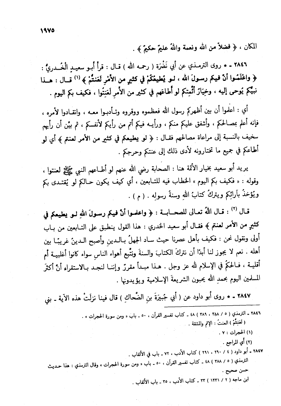 2846 - * روى الترمذي عن أبي نضرة (رحمه الله) قال: قرأ أبو سعيد الخدري: {وَاعْلَمُوا أَنَّ فِيكُمْ رَسُولَ اللَّهِ لَوْ يُطِيعُكُمْ فِي كَثِيرٍ مِنَ الْأَمْرِ لَعَنِتُّمْ} (1) قال: هذا نبيكم يُوحى إليه، وخيارُ أئمتكم لو أطاعهم في كثير من الأمر لعنتُوا، فكيف بكم اليوم.