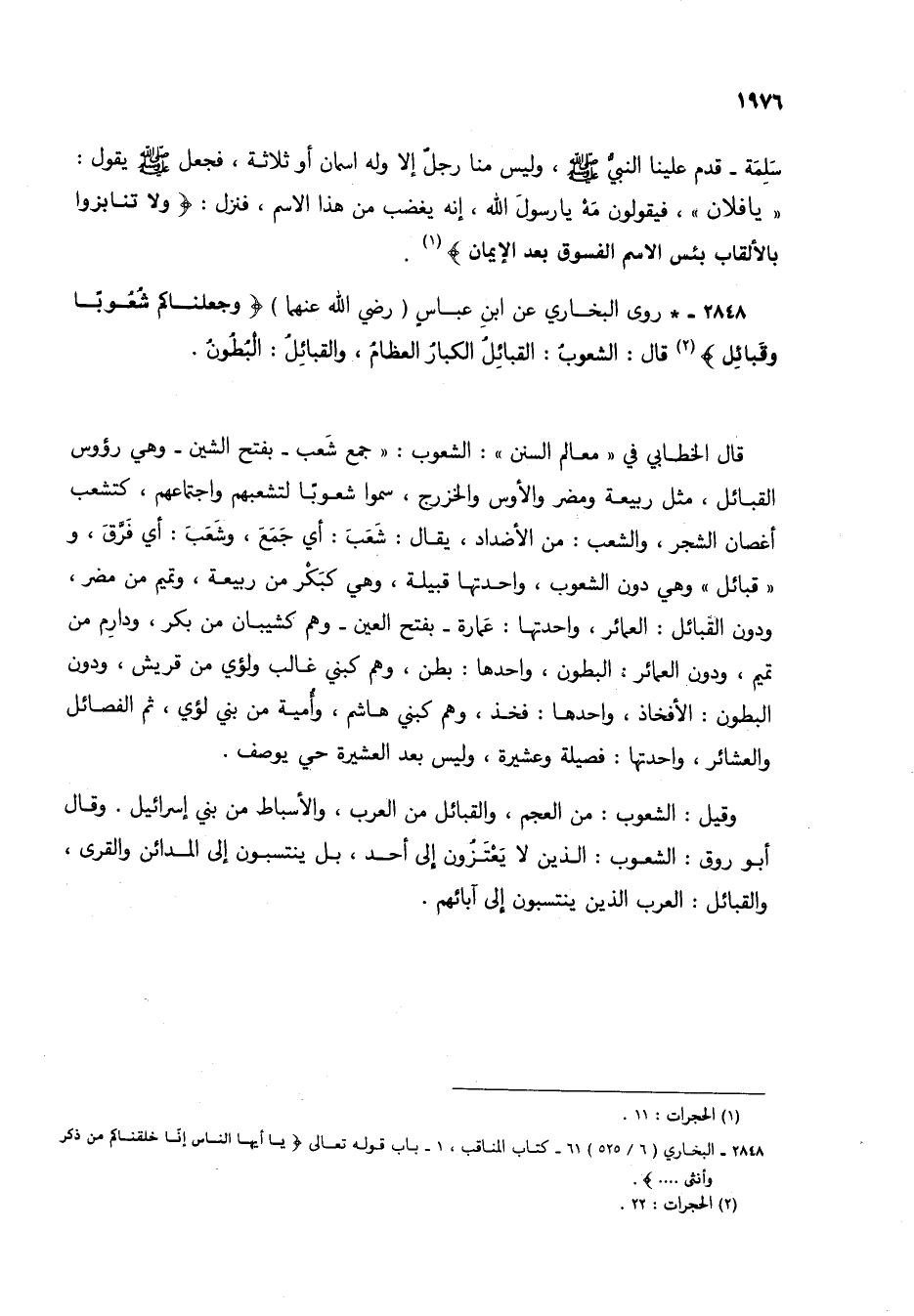 2848 - * روى البخاري عن ابن عباس (رضي الله عنهما) {وَجَعَلْنَاكُمْ شُعُوبًا وَقَبَائِلَ} (2) قال: الشعوبُ: القبائل الكبار العظام، والقبائل: البُطُون.