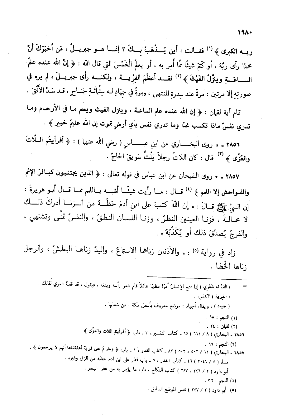 2857 - * روى الشيخان عن ابن عباس في قوله تعالى: {الَّذِينَ يَجْتَنِبُونَ كَبَائِرَ الْإِثْمِ وَالْفَوَاحِشَ إِلَّا اللَّمَمَ} (4) قال: ما رأيت شيئاً أشبه باللمم مما قال أبو هريرة: إن النبي صلى الله عليه وسلم قال: "إن الله كتب على ابن آدم حظه من الزنا أدرك ذلك لا محالة، فزنا العينين النظر، وزنا اللسان النطق، والنفس تمنى وتشتهي، والفرج يُصدِّقُ ذلك أو يكذبه".