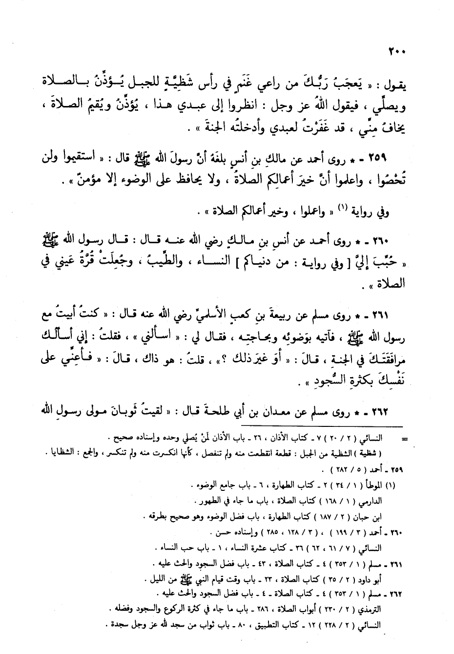 260 - * روى أحمد عن أنس بن مالك رضي الله عنه قال: قال رسول الله صلى الله لعيه وسلم "حُبِّبَ إليَّ [وفي رواية: من دنياكم] النساء، والطيبُ، وجُعلتْ قرةُ عيني في الصلاة".