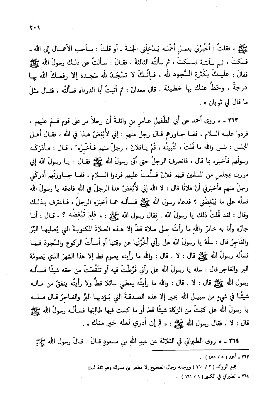263 - * روى أحمد عن أبي الطفيل عامر بن واثلة أن رجلاً مر على قوم فسلم عليهم، فردوا عليه السلام، فلما جاوزهم قال رجل منهم: إني لأُبْغِضُ هذا في الله، فقال أهل المجلس: بئس والله ما قُلتَ، لتبينَّه، قُمْ يا فلانُ، رجلٌ منهم فأخبِرْهُ، قال: فأدركه رسولهم فأخبره بما قال، فانصرف الرجل حتى أتى رسول الله صلى الله عليه وسلم فقال: يا رسول الله إني مررت بمجلسٍ من المسلمين فيهم فلانٌ سلمتُ عليهم فردوا السلام، فلما جاوزتُهم أدركني رجلٌ منهم فأخبرني أن فلاناً قال: لا الله إني لأبْغِضُ هذا الرجل في الله فادعُه يا رسول الله فسله على ما يُبْغِضُني؟ فدعاه رسول الله صلى الله عليه وسلم فسأله عما أخبره الرجلُ، فاعترف بذلك وقال: لقد قلتُ ذلك يا رسول الله. فقال رسول الله صلى الله عليه وسلم: "فلِمَ تُبْغِضُه؟ " قال: أنا جارُه وأنا به خابرّ والله ما رأيتُه صلى صلاة قط إلا هذه الصلاة المكتوبة التي يُصليها البَّرُ والفاجرُ قال: سلهُ يا رسول الله هل رآني أخرْتُها عن وقتها أو أسأتُ الركوع والسُّجود فيها فسأله رسول الله صلى الله عليه وسلم قال: لا. قال: والله ما رأيته يصوم قط إلا هذا الشهر الذي يصومه البر والفاجر قال: سله يا رسول الله هل رآني فرَّطْتُ فيه أو تنقَّصْتُ من حقه شيئاً فسأله رسول الله صلى الله عليه وسلم قال: لا. قال: والله ما رأيته يعطي سائلاً قطُّ ولا رأيته ينفق من ماله شيئاً في شيءٍ من سبيل الله بخير إلا هذه الصدقة التي يؤديها البرُّ والفاجرُ قال فسله يا رسول الله هل كتمتُ من الزكاة شيئاً قط أو ما كست فيها طالبها فسأله رسول الله صلى الله عليه وسلم قال: لا. فقال رسول الله صلى الله عليه وسلم: "قم إن أدري لعله خير منك".