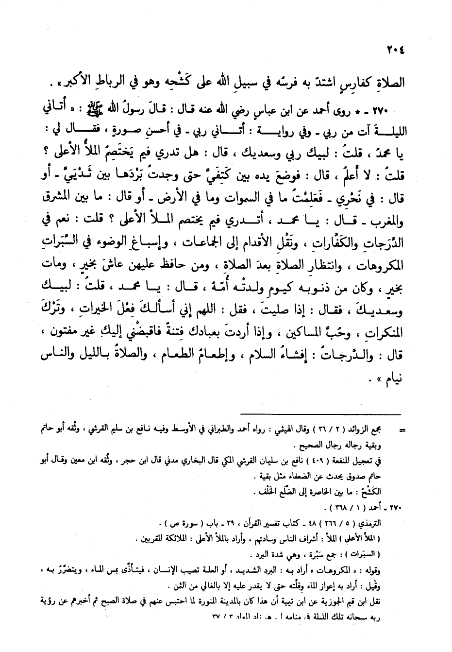 270 - * روى أحمد عن ابن عباس رضي الله عنه قال: قال رسول الله صلى الله عليه وسلم: "أتاني الليلة آت من ربي- وفي رواية: أتاني ربي - في أحسن صورةٍ، فقال لي: يا محمد، قلت: لبي ربي وسعديك، قال: هل تدري فيم يختصمُ الملأُّ الأعلى؟ قلت: لا أعلم، قال: فوضع يده بين كتفي حتى وجدتُ بردَها بين ثدييَّ- أو قال: في نحري - فعلمتُ ما في السموات وما في الأرض - أو قال: ما بين المشرق والمغرب - قال: يا محمد، أتدري فيم يختصم الملأ الأعلى؟ قلت: نعم في الدرجات والكفارات، ونقلِ الأقدام إلى الجماعات، وإسباغ الوضوء في السَّبَراتِ المكروهات، وانتظار الصلاة بعد الصلاة، ومن حافظ عليهن عاش بخير، ومات بخير، وكان من ذنوبه كيوم ولدته أمه، قال: يا محمد، قلت: لبيك وسعديك، فقال: إذا صلتَ، فقل: اللهم إني أسألك فعلَ الخيراتِ، وترك المنكرات، وحُبَّ المساكين، وإذا أردت بعبادك فتنةً فاقبضْني إليك غير مفتون، قال: والدرجاتُ: إفشاءُ السلام، وإطعام الطعام، والصلاة بالليل والناس نيام".