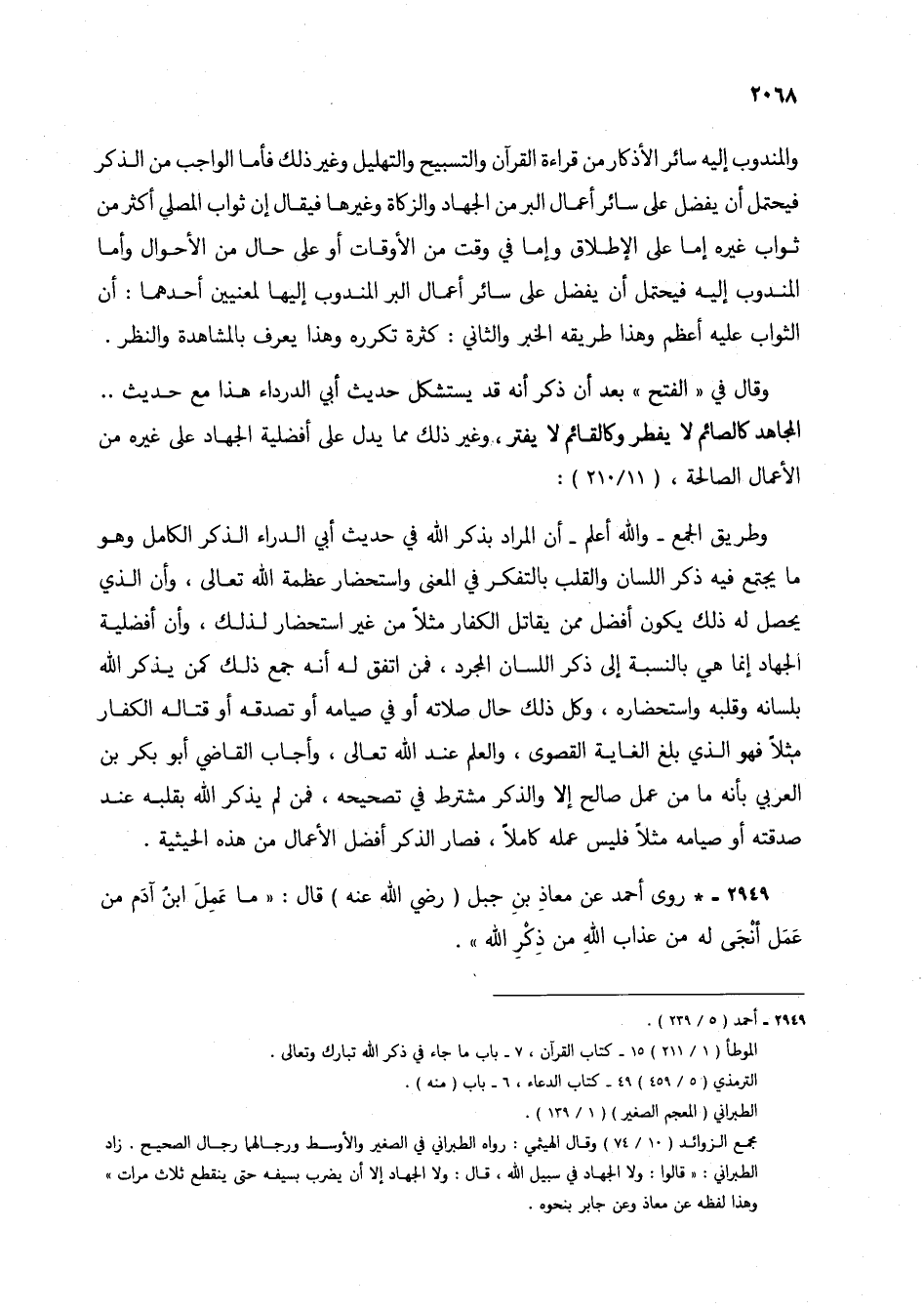 وطريق الجمع- والله أعلم- أن المراد بذكر الله في حديث أبي الدرداء الذكر الكامل وهو ما يجتمع فيه ذكر اللسان والقلب بالتفكر في المعنى واستحضار عظمة الله تعالى، وأن الذي يحصل له ذلك يكون أفضل ممن يقاتل الكفار مثلاً من غير استحضار لذلك، وأن أفضلية الجهاد إنما هي بالنسبة إلى ذكر اللسان المجرد، فمن اتفق له أنه جمع ذلك كمن يذكر الله بلسانه وقلبه واستحضاره، وكل ذلك حال صلاته أو في صيامه أو تصدقه أو قتاله الكفار مثلاً فهو الذي بلغ الغاية القصوى، والعلم عند الله تعالى، وأجاب القاضي أبو بكر بن العربي بأنه ما من عمل صالح إلا والذكر مشترط في تصحيحه، فمن لم يذكر الله بقلبه عند صدقته أو صيامه مثلاً فليس عمله كاملاً، فصار الذكر أفضل الأعمال من هذه الحيثية.