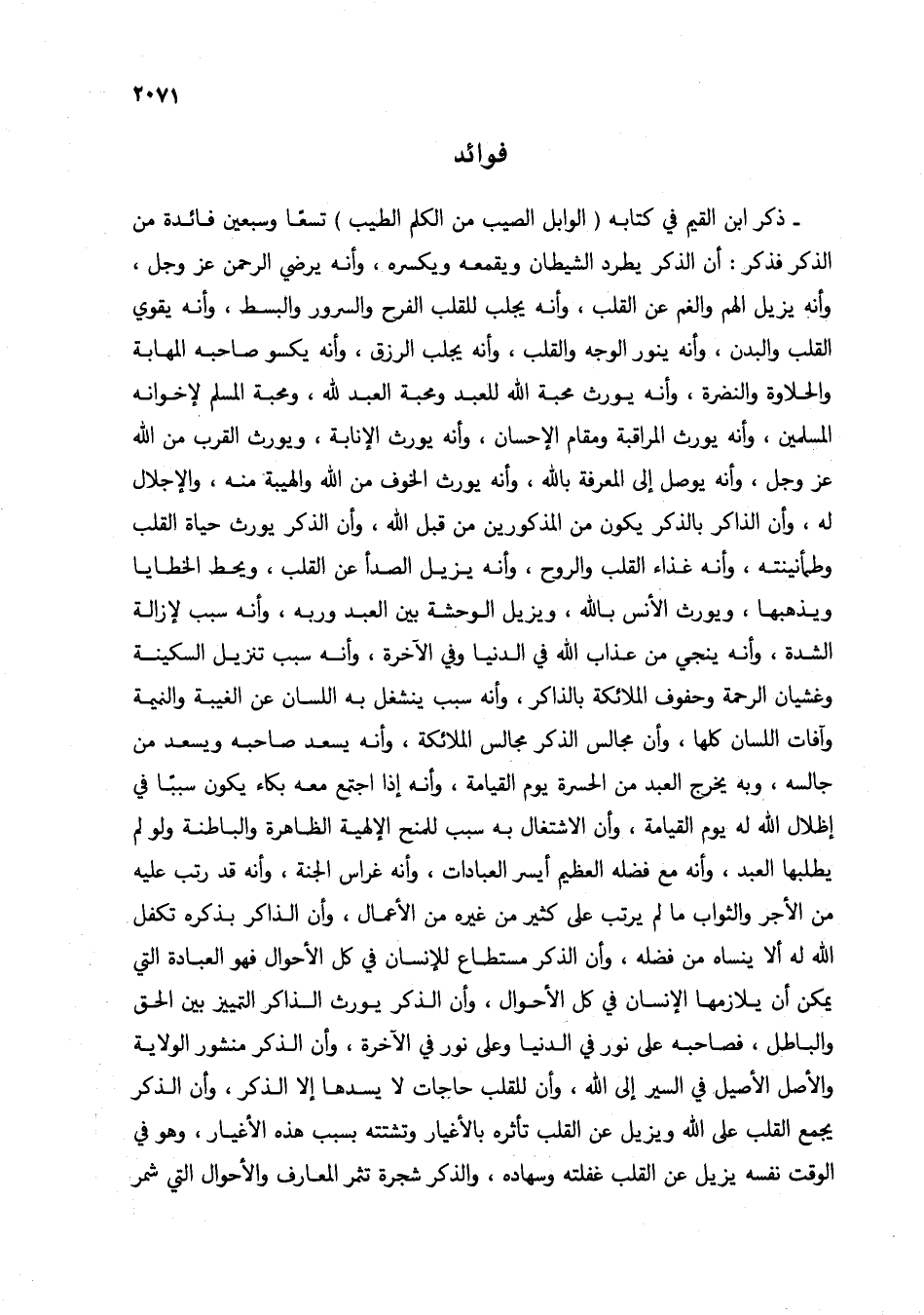 ذكر ابن القيم في كتابه (الوابل الصيب من الكلم الطيب) تسعاً وسبعين فائدة من الذكر فذكر: أن الذكر يطرد الشيطان ويقمعه ويكسره، وأنه يرضي الرحمن عز وجل، وأنه يزيل الهم والغم عن القلب، وأنه يجلب للقلب الفرح والسرور والبسط، وأنه يقوي القلب والبدن، وأنه ينور الوجه والقلب، وأنه يجلب الرزق، وأنه يكسو صاحبه المهابة والحلاوة والنضرة، وأنه يورث محبة الله للعبد ومحبة العبد لله، ومحبة المسلم لإخوانه المسلمين، وأنه يورث المراقبة ومقام الإحسان، وأنه يورث الإنابة، ويورث القرب من الله عز وجل، وأنه يوصل إلى المعرفة بالله، وأنه يورث الخوف من الله والهيبة منه، والإجلال له، وأن الذاكر بالذكر يكون من المذكورين من قبل الله، وأن الذكر يورث حياة القلب وطمأنينته، وأنه غذاء القلب والروح، وأنه يزيل الصدأ عن القلب، ويحط الخطايا ويذهبها، ويورث الأنس بالله، ويزيل الوحشة بين العبد وربه، وأنه سبب لإزالة الشدة، وأنه ينجي من عذاب الله في الدنيا وفي الآخرة، وأنه سبب تنزيل السكينة وغشيان الرحمة وحفوف الملائكة بالذاكر، وأنه سبب ينشغل به اللسان عن الغيبة والنميمة وآفات اللسان كلها، وأن مجالس الذكر مجالس الملائكة، وأنه يسعد صاحبه ويسعد من جالسه، وبه يخرج العبد من الحسرة يوم القيامة، وأنه إذا اجتمع معه بكاء يكون سبباً في إظلال الله له يوم القيامة، وأن الاشتغال به سبب للمنح الإلهية الظاهرة والباطنة ولو لم يطلبها العبد، وأنه مع فضله العظيم أيسر العبادات، وأنه غراس الجنة، وأنه قد رتب عليه من الأجر والثواب ما لم يرتب على كثير من غيره من الأعمال، وأن الذاكر بذكره تكفل الله له ألا ينساه من فضله، وأن الذكر مستطاع للإنسان في كل الأحوال فهو العبادة التي يمكن أن يلازمها الإنسان في كل الأحوال، وأن الذكر يورث الذاكر التمييز بين الحق والباطل، فصاحبه على نور في الدنيا وعلى نور في الآخرة، وأن الذكر منشور الولاية والأصل الأصيل في السير إلى الله، وأن للقلب حاجات لا يسدها إلا الذكر، وأن الذكر يجمع القلب على الله ويزيل عن القلب تأثره بالأغيار وتشتته بسبب هذه الأغيار، وهو في الوقت نفسه يزيل عن القلب غفلته وسهاده، والذكر شجرة تثمر المعارف والأحوال التي شمر