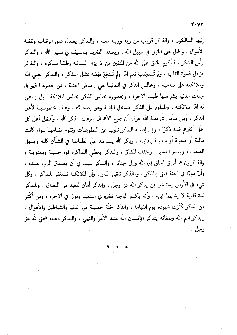 إليها السالكون، والذاكر قريب من ربه وربه معه، والذكر يعدل عتق الرقاب ونفقة الأموال، والحمل على الخيل في سبيل الله، ويعدل الضرب بالسيف في سبيل الله، والذكر رأس الشكر، فأكرم الخلق على الله من المتقين من لا يزال لسانه رطباً بذكره، والذكر يزيل قسوة القلب، ولم تستجلب نعم الله ولم تدفع نقمه بمثل الذكر، والذكر يصلي الله وملائكته على صاحبه، ومجالس الذكر في الدنيا هي رياض الجنة، فمن حضرها فهو في جنات الدنيا يشم منها طيب الآخرة، وبحضوره مجالس الذكر يجالس الملائكة، بل يباهي به الله ملائكته، والمداوم على الذكر يدخل الجنة وهو يضحك، وهذه خصوصية لأهل الذكر، ومن تأمل شريعة الله عرف أن جميع الأعمال شرعت لذكر الله، وأفضل أهل كل عمل أكثرهم فيه ذكراً، وإن إدامة الذكر تنوب عن التطوعات وتقوم مقامها سواء كانت مالية أو بدنية أو مالية بدنية، وذكر الله يساعد على الطاعة في الشأن كله ويسهل الصعب، وييسر العسير، ويخفف المشاق، والذكر يعطي الذاكرة قوة حسية ومعنوية، والذاكرون هم أسبق الخلق إلى الله وإلى جناته، والذكر يعطي الذاكرة قوة حسية ومعنوية، والذاكرون هم أسبق الخلق إلى الله وإلى جناته، والذكر سبب في أن يصدق الرب عبده، وأن دوراً في الجنة تبنى بالذكر، وبالذكر تتقى النار، وأن الملائكة تستغفر للذاكر، وكل شيء في الأرض يستبشر بمن يذكر الله عز وجل، والذكر أمان للعبد من النفاق، وللذكر لذة قلبية لا يشبهها شيء، وأنه يكسو الوجه نضرة في الدنيا ونوراً في الآخرة، ومن أكثر من الذكر كثرت شهوده يوم القيامة، والذكر جنة حصينة من الدنيا والشياطين والأهوال، وبذكر اسم الله وصفاته يتذكر الإنسان الله عند الأمر والنهي، والذكر دعاء ضمني لله عز وجل.