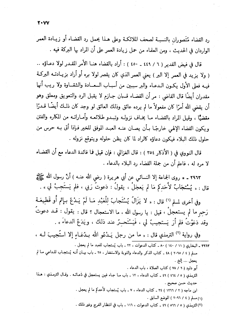 قال في فيض القدير (6/ 449 - 450): أراد بالقضاء هنا الأمر المقدر لولا دعاؤه .. (ولا يزيد في العمر إلا البر) يعني العمر الذي كان يقصر لولا بره أو أراد بزيادته البركة فيه فعلى الأول يكون الدعاء والبر سببين من أسباب السعادة والشقاوة ولا ريب أنهما مقدران أيضاً قال القاضي: مر أن القضاء قسمان جازم لا يقبل الرد والتعويق ومعلق وهو أن يقضي الله أمراً كان مفعولاً ما لم يرده عائق وذلك العائق لو وجد كان ذلك أيضاً قدراً مقضياً، وقيل المراد بالقضاء ما يخاف نزوله وتبدو طلائعه وأماراته من الكاره والفتن ويكون القضاء الإلهي خارجاً بأن يصان عنه العبد الموفق للخير فإذا أتى به حرس من حلول ذلك البلاء فيكون دعاؤه كالراد لما كان يظن حلوله ويتوقع نزوله.