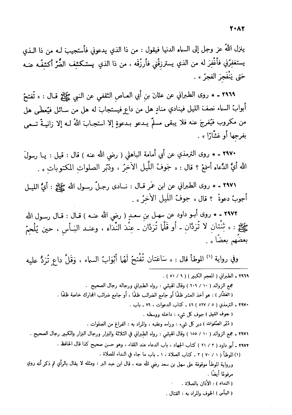 2971 - * روى الطبراني عن ابن عمر قال: نادى رجل رسول الله صلى الله عليه وسلم: أي الليل أجوب دعوة؟ قال "جوف الليل الآخر".