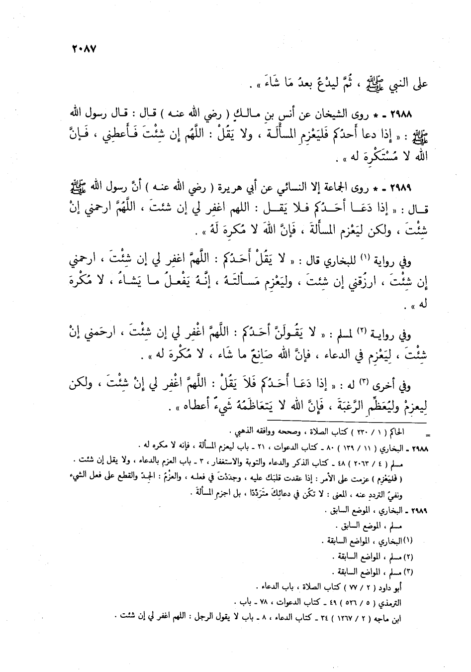 2989 - * روى الجماعة إلا النسائي عن أبي هريرة (رضي الله عنه) أن رسول الله صلى الله عليه وسلم قال: "إذا دعا أحدكم فلا يقل: اللهم اغفر لي إن شئت، اللهم ارحمني إن شئت، ولكن ليعزم المسألة، فإن الله لا مكره له".