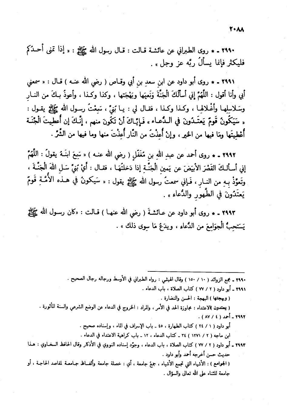 2991 - * روى أبو داود عن ابن سعد بن أبي وقاص (رضي الله عنه) قال: "سمعني أبي وأنا أقول: اللهم إني أسألك الجنة ونعيمها وبهجتها، وكذا وكذا، وأعوذ بك من النار وسلاسلها وأغلالها، وكذا وكذا، فقال لي: يا بني، سمعت رسول الله صلى الله عليه وسلم يقول: "سيكون قوم يعتدون في الدعاء" فإياك أن تكون منهم، إنك إن أعطيت الجنة أعطيتها وما فيها من الخير، وإن أعذت من النار أعذت منها وما فيها من الشر.