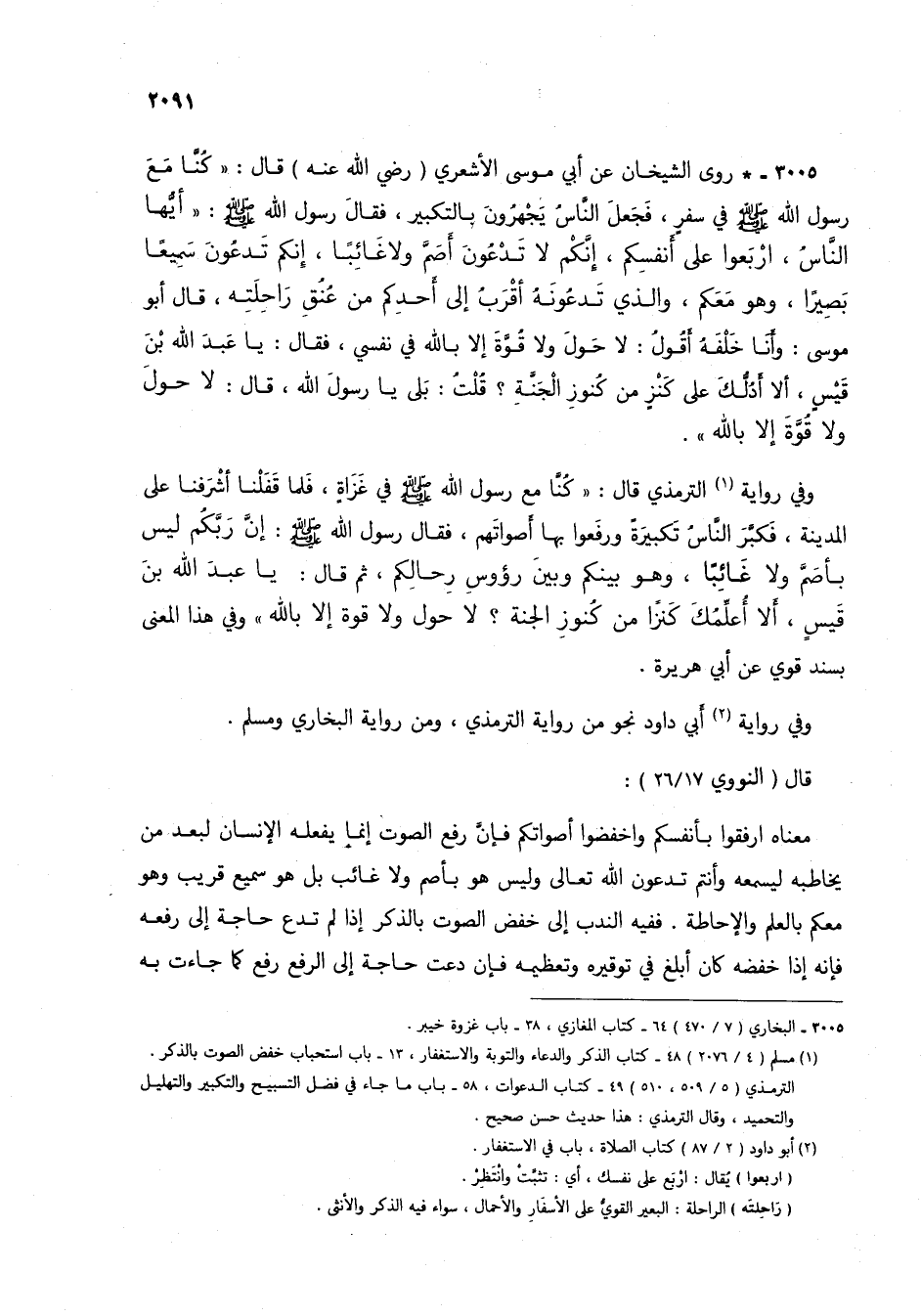 3005 - * روى الشيخان عن أبي موسى الأشعري (رضي الله عنه) قال: "كنا مع رسول الله صلى الله عليه وسلم في سفر، فجعل الناس يجهرون بالتكبير، فقال رسول الله صلى الله عليه وسلم: "أيها الناس، اربعوا على أنفسكم، إنكم لا تدعون أصم ولا غائباً، إنكم تدعون سميعاً بصيراً، وهو معكم، والذي تدعونه أقرب إلى أحدكم من عنق راحلته، قال أبو موسى: وأنا خلفه أقول: لا حول ولا قوة إلا بالله في نفسي، فقال: يا عبد الله بن قيس، ألا أدلك على كنز من كنوز الجنة؟ قلت: بلى يا رسول الله، قال: لا حول ولا قوة إلا بالله".