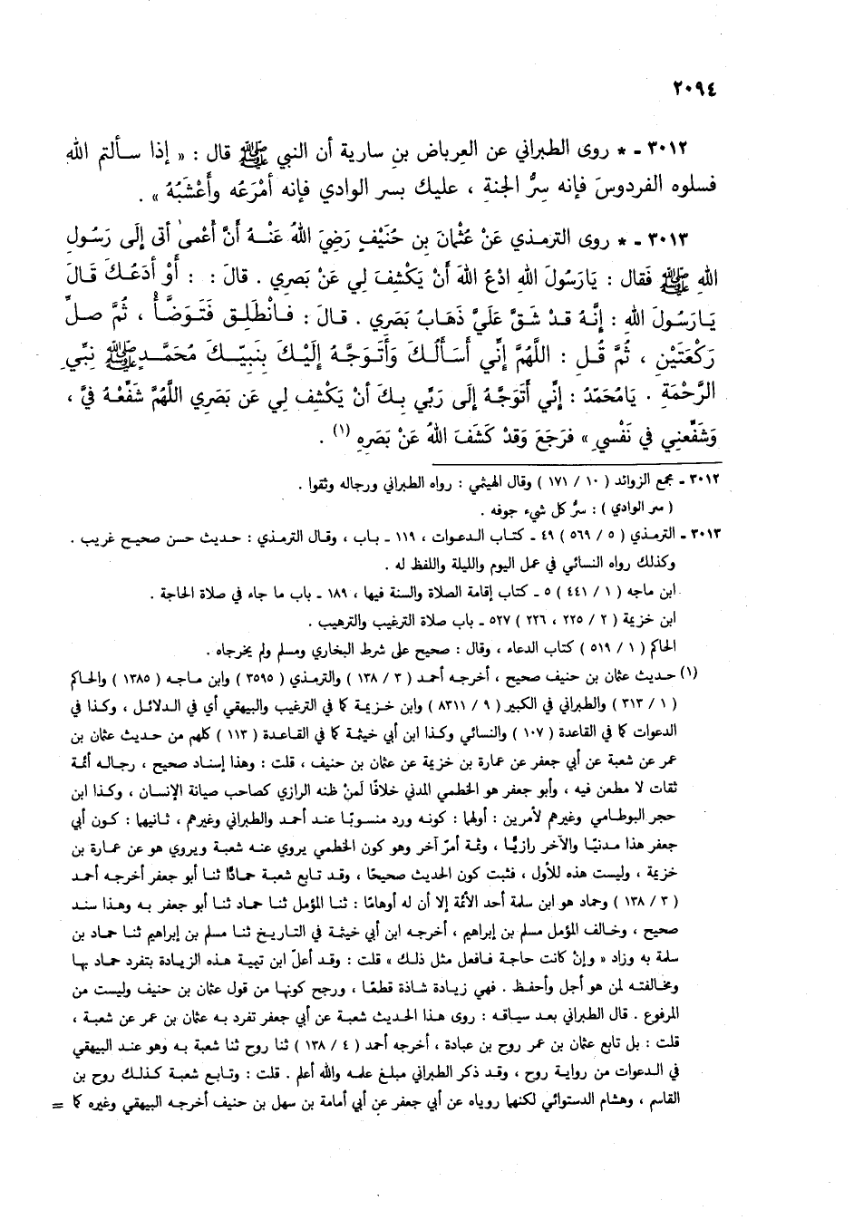 (1) حديث عثمان بن حنيف صحيح، أخرجه أحمد (3/ 138) والترمذي (3595) وابن ماجه (1385) والحاكم (1/ 313) والطبراني في الكبير (9/ 8311) وابن خزيمة كما في الترغيب والبيهقي أي في الدلائل، وكذا في الدعوات كما في القاعدة (107) والنسائي وكذا ابن أبي خيثمة كما في القاعدة (113) كلهم من حديث عثمان بن عمر عن شعبة عن أبي جعفر عن عمارة بن خزيمة عن عثمان بن حنيف، قلت: وهذا إسناد صحيح، رجاله أئمة ثقات لا مطعن فيه، وأبو جعفر هو الخطمي المدني خلافاً لمن ظنه الرازي كصاحب صيانة الإنسان، وكذا ابن حجر البوطامي وغيرهم لأمرين: أولهما: كونه ورد منسوباً عند أحمد والطبراني وغيرهم، ثانيهما: كون أبي جعفر هذا مدنياً والآخر رازياً، وثمة أمر آخر وهو كون الخطمي يروي عنه شعبة ويروي هو عن عمارة بن خزيمة، وليست هذه للأول، فثبت كون الحديث صحيحاً، وقد تابع شعبة حمخاداً ثنا أبو جعفر أخرجه أحمد (3/ 138) وحماد هو ابن سلمة أحد الأئمة إلا أن له أوهاماً: ثنا المؤمل ثنا حماد ثنا أبو جعفر به وهذا سند صحيح، وخالف المؤمل مسلم بن إبراهيم، أخرجه ابن أبي خيثمة في التاريخ ثنا مسلم بن إبراهيم ثنا حماد بن سلمة به وزاد "وإن كانت حاجة فافعل مثل ذلك" قلت: وقد أعل ابن تيمية هذه الزيادة بتفرد حماد بها ومخالفته لمن هو أجل وأحفظ. فهي زيادة شاذة قطعاً، ورجح كونها من قول عثمان بن حنيف وليست من المرفوع. قال الطبراني بعد سياقه: روى هذا الحديث شعبة عن أبي جعفر تفرد به عثمان بن عمر عن شعبة، قلت: بل تابع عثمان بن عمر روح بن عبادة، أخرجه أحمد (4/ 138) ثنا روح ثنا شعبة به وهو عند البيهقي في الدعوات من رواية روح، وقد ذكر الطبراني مبلغ علمه والله أعلم. قلت: وتابع شعبة كذلك روح بن القاسم، وهشام الدستوائي لكنهما روياه عن أبي جعفر عن أبي أمامة بن سهل بن حنيف أخرجه البيهقي وغيره كما =