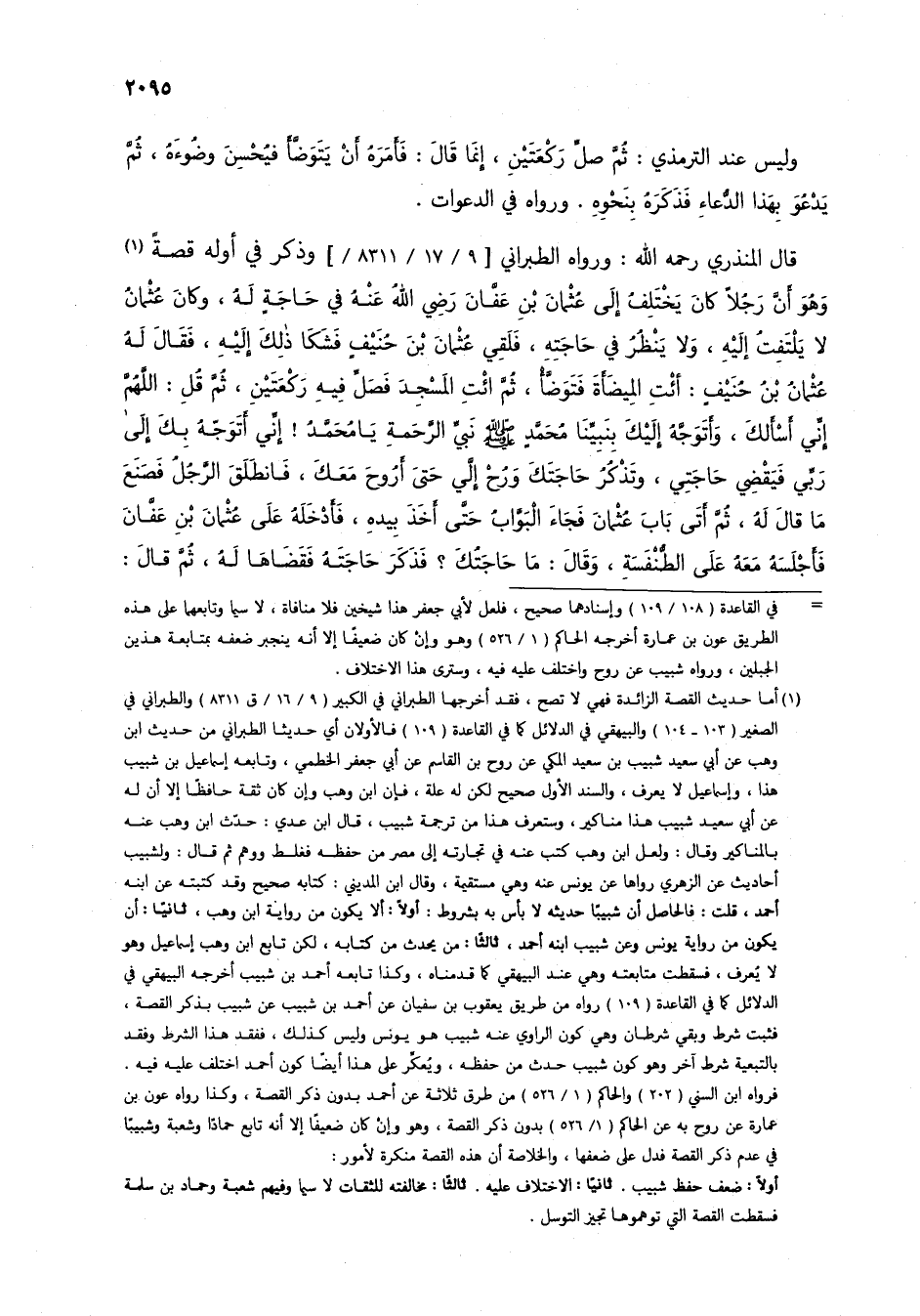 قال المنذري رحمه الله: ورواه الطبراني [9/ 17/ 8311/] وذكر في أوله قصة (1) وهو أن رجلاً كان يختلف إلى عثمان بن عفان رضي الله عنه في حاجة له، وكان عثمان لا يلتفت إليه، ولا ينظر في حاجته، فلقي عثمان بن حنيف فشكا ذلك إليه، فقال له عثمان بن حنيف: أئت الميضأة فتوضأ، ثم ائت المسجد فصل فيه ركعتين، ثم قل: اللهم إني أسألك، وأتوجه إليك بنبينا محمد صلى الله عليه وسلم نبي الرحمة يا محمد! إني أتوجه بك إلى ربي فيقضي حاجتي، وتذكر حاجتك ورح إلى حتى أروح معك، فانطلق الرجل فصنع ما قال له، ثم أتى باب عثمان فجاء البواب حتى أخذ بيده، فأدخله على عثمان بن عفان فأجلسه معه على الطنفسة، وقال: ما حاجتك؟ فذكر حاجته فقضاها له، ثم قال: