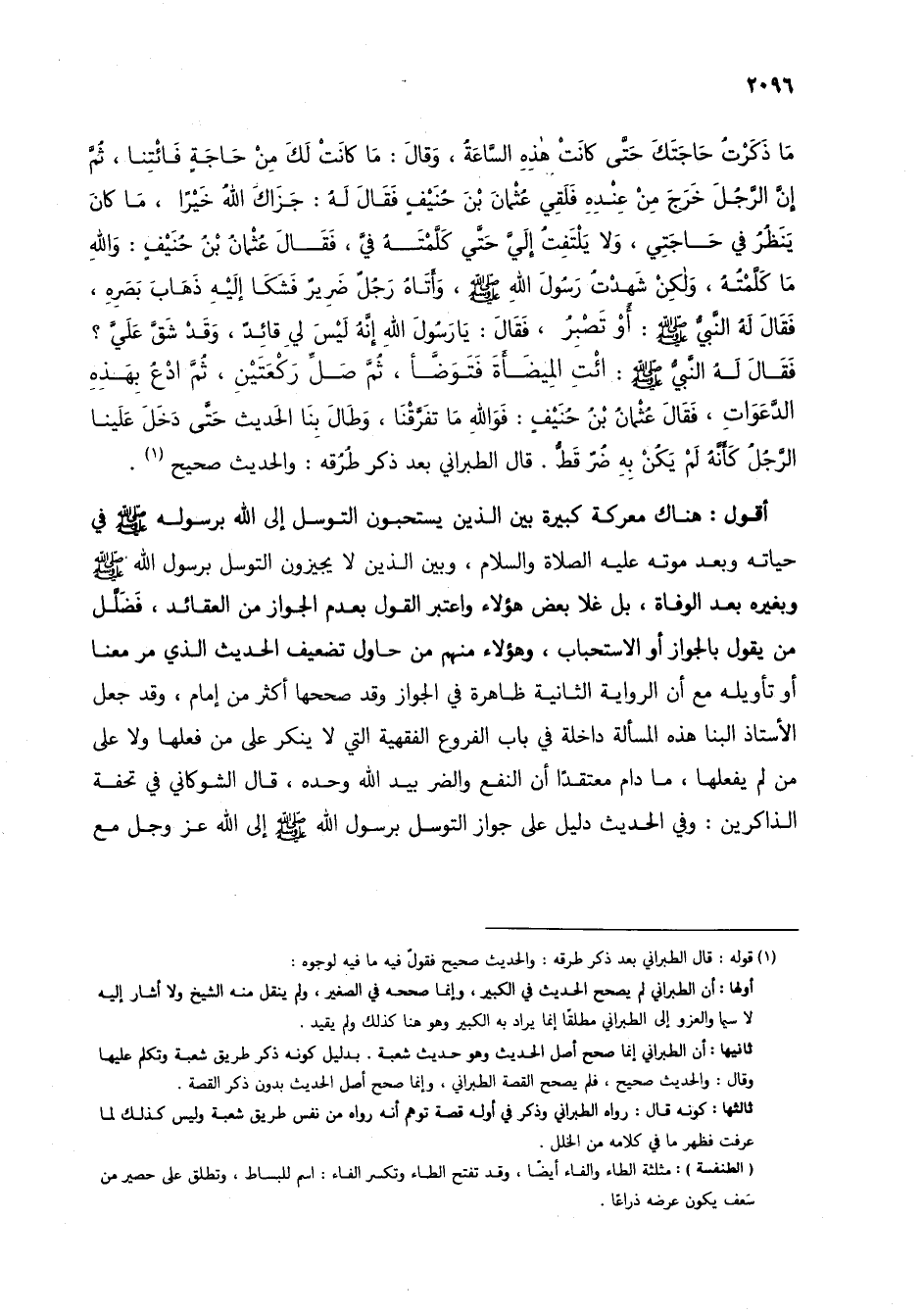 أقول: هناك معركة كبيرة بين الذين يستحبون التوسل إلى الله برسوله صلى الله عليه وسلم في حياته وبعد موته عليه الصلاة والسلام، وبين الذين لا يجيزون التوسل برسول الله صلى الله عليه وسلم وبغيره بعد الوفاة، بل غلا بعض هؤلاء واعتبر القول بعدم الجواز من العقائد، فضلل من يقول بالجواز أو الاستحباب، وهؤلاء منهم من حاول تضعيف الحديث الذي مر معنا أو تأويله مع أن الرواية الثانية ظاهرة في الجواز وقد صححها أكثر من إمام، وقد جع الأستاذ البنا هذه المسألة داخلة في باب الفروع الفقهية التي لا ينكر على من فعلها ولا على من لم يفعلها، ما دام معتقداً أن النفع والضر بيد الله وحده، قال الشوكاني في تحفة الذاكرين: وفي الحديث دليل على جواز التوسل برسول الله صلى الله عليه وسلم إلى الله عز وجل مع