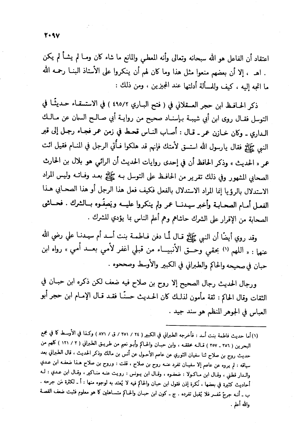 وقد روى أيضاً أن النبي صلى الله عليه وسلم قال لما دفن فاطمة بنت أسد أم سيدنا علي رضي الله عنهما: "اللهم (1) بحقي وحق الأنبياء من قبلي اغفر لأمي بعد أمي" رواه ابن حبان في صحيحه والحاكم والطبراني في الكبير والأوسط وصححوه.
