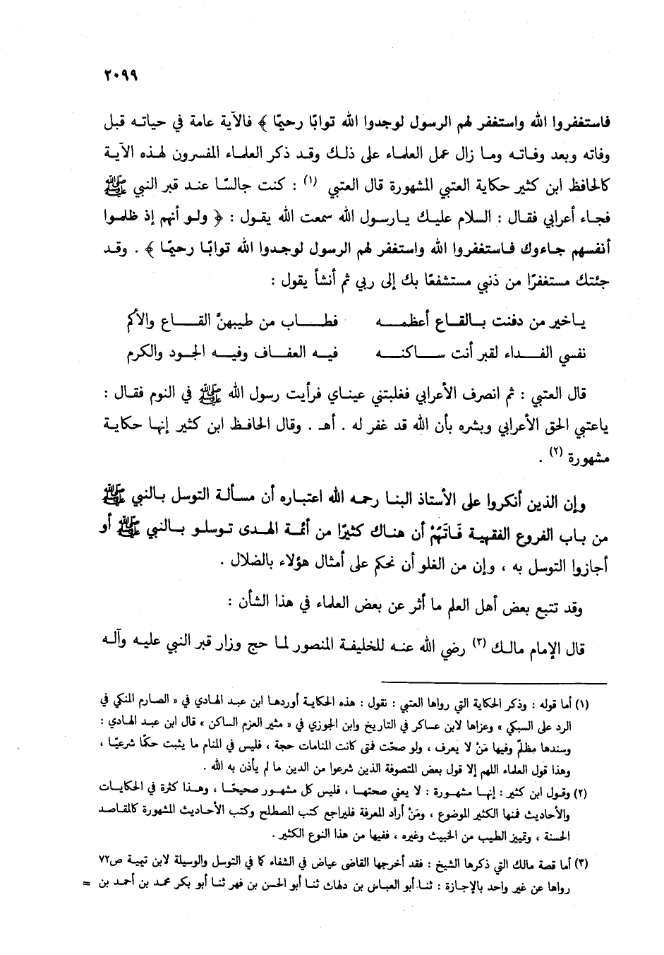 (1) أما قوله: وذكر الحكاية التي رواها العتبي: نقول: هذه الحكاية أوردها ابن عبد الهادي في "الصارم المنكي في الرد على السبكي" وعزاها لابن عساكر في التاريخ وابن الجوزي في "مثير العزم الساكن" قال ابن عبد الهادي: وسندها مظلم وفيها من لا يعرف، ولو صحت فمتى كانت المنامات حجة، فليس في المنام ما يثبت حكماً شرعياً، وهذا قول العلماء اللهم إلا قول بعض المتصوفة الذين شرعوا من الدين ما لم يأذن به الله.