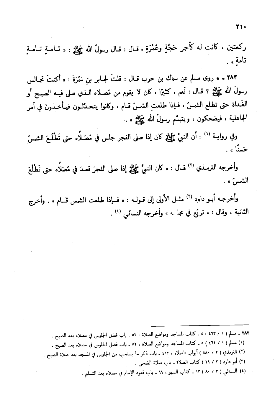 283 - * روى مسلم عن سماك بن حرب قال: قلت لجابر بن سمُرَة: "أكنت تجالس رسول الله صلى الله لعيه وسلم؟ قال: نعم، كثيراً، كان لا يقوم من مُصلاه الذي صلى فيه الصبح أو الغداة حتى تطلع الشمسُ، فإذا طلعت الشمس قام، وكانوا يتحدثون فيأخذون في أمر الجاهلية، فيضحكون، ويتبسم رسول الله صلى الله عليه وسلم".