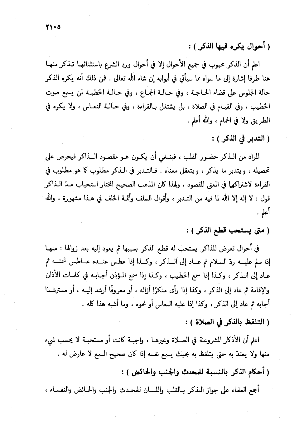 اعلم أن الذكر محبوب في جميع الأحوال إلا في أحوال ورد الشرع باستثنائها تذكر منها هنا طرفا إشارة إلى ما سواه مما سيأتي في أبوابه إن شاء الله تعالى. فمن ذلك أنه يكره الذكر حالة الجلوس على قضاء الحاجة، وفي حالة الجماع، وفي حالة الخطبة لمن يسمع صوت الخطيب، وفي القيام في الصلاة، بل يشتغل بالقراءة، وفي حالة النعاس، ولا يكره في الطريق ولا في الحمام، والله أعلم.