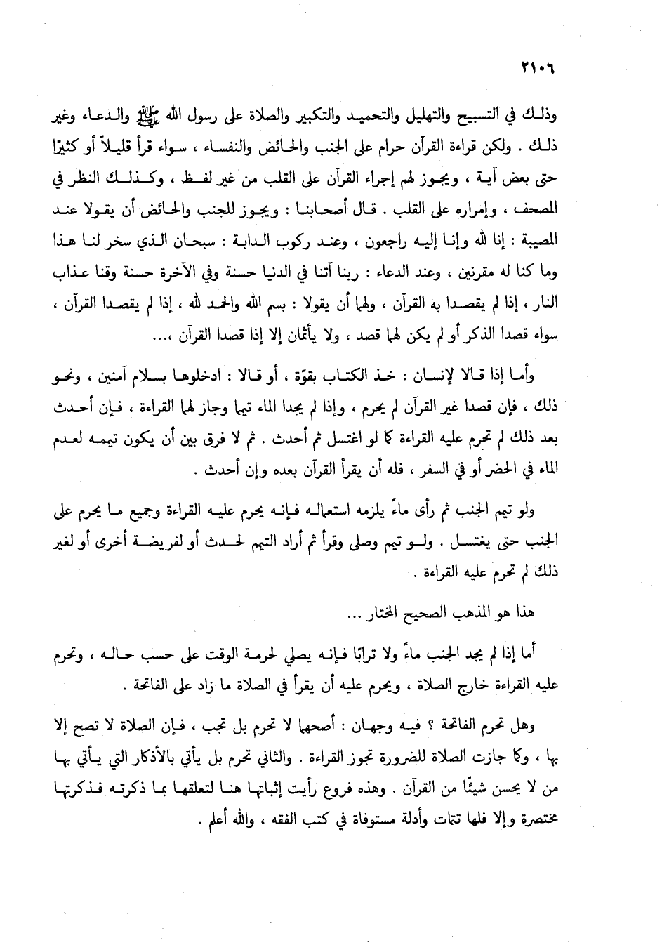وذلك في التسبيح والتهليل والتحميد والتكبير والصلاة على رسول الله صلى الله عليه وسلم والدعاء وغير ذلك. ولكن قراءة القرآن حرام على الجنب والحائض والنفساء، سواء قرأ قليلاً أو كثيراً حتى بعض آية، ويجوز لهم إجراء القرآن على القلب من غير لفظ، وكذلك النظر في المصحف، وإمراره على القلب. قال أصحابنا: ويجوز للجنب والحائض أن يقولا عند المصيبة: إنا لله وإنا إليه راجعون، وعند ركوب الدابة: سبحان الذي سخر لنا هذا وما كنا له مقرنين، وعند الدعاء: ربنا آتنا في الدنيا حسنة وفي الآخرة حسنة وقنا عذاب النار، إذا لم يقصدا به القرآن، ولهما أن يقولا: بسم الله والحمد لله، إذا لم يقصدا القرآن، سواء قصدا الذكر أو لم يكن لهما قصد، ولا يأثمان إلا إذا قصدا القرآن، ..