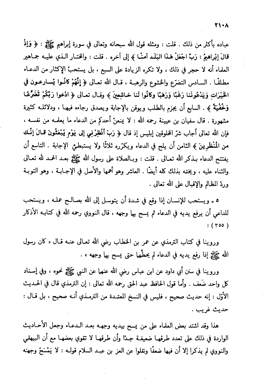 هذا وقد اشتد بعض العلماء على من يمسح بيديه وجهه بعد الدعاء وجعل الأحاديث الواردة في ذلك على تعدد طرقها ضعيفة جداً وأن طرقها لا تقوي بعضها مع أن البيهقي والنووي لم يذكرا إلا أن فيها ضعفاً ونقلوا عن العز بن عبد السلام قوله: لا يمسح وجهه