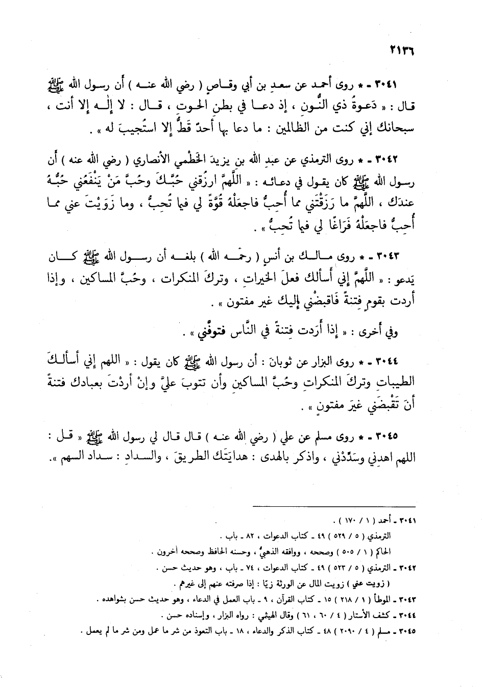 3041 - *روى أحمد عن سعد بن أبي وقاص (رضي الله عنه) أن رسول الله صلى الله عليه وسلم قال: "دعوة ذي النون، إذ دعا في بطن الحوت، قال: لا إله إلا أنت، سبحانك إني كنت من الظالمين: ما دعا بها أحد قط إلا استجيب له".