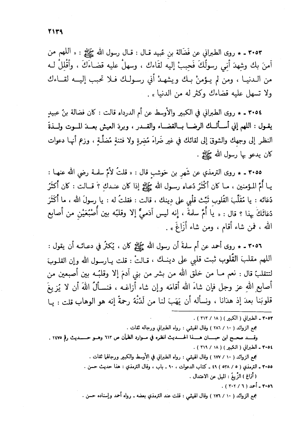 3053 - * روى الطبراني عن فضالة بن عبيد قال: قال رسول الله صلى الله عليه وسلم: "اللهم من آمن بك وشهد أني رسولك فحبب إليه لقاءك، وسهل عليه قضاءك، وأقلل له من الدنيا، ومن لم يؤمن بك ويشهد أني رسولك فلا تحبب إليه لقاءك ولا تسهل عليه قضاءك وكثر له من الدنيا".