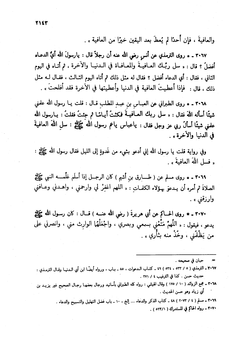 3068 - * روى الطبراني عن العباس بن عبد المطلب قال: قلت يا رسول الله علمني شيئاً أسأله الله فقال: "سل ربك العافية فمكثت أياماً ثم جئت فقلت: يا رسول الله علمني شيئاً أسأل ربي عز وجل فقال: يا عباس يا عم رسول الله صلى الله عليه وسلم: سل الله العافية في الدنيا والآخرة".
